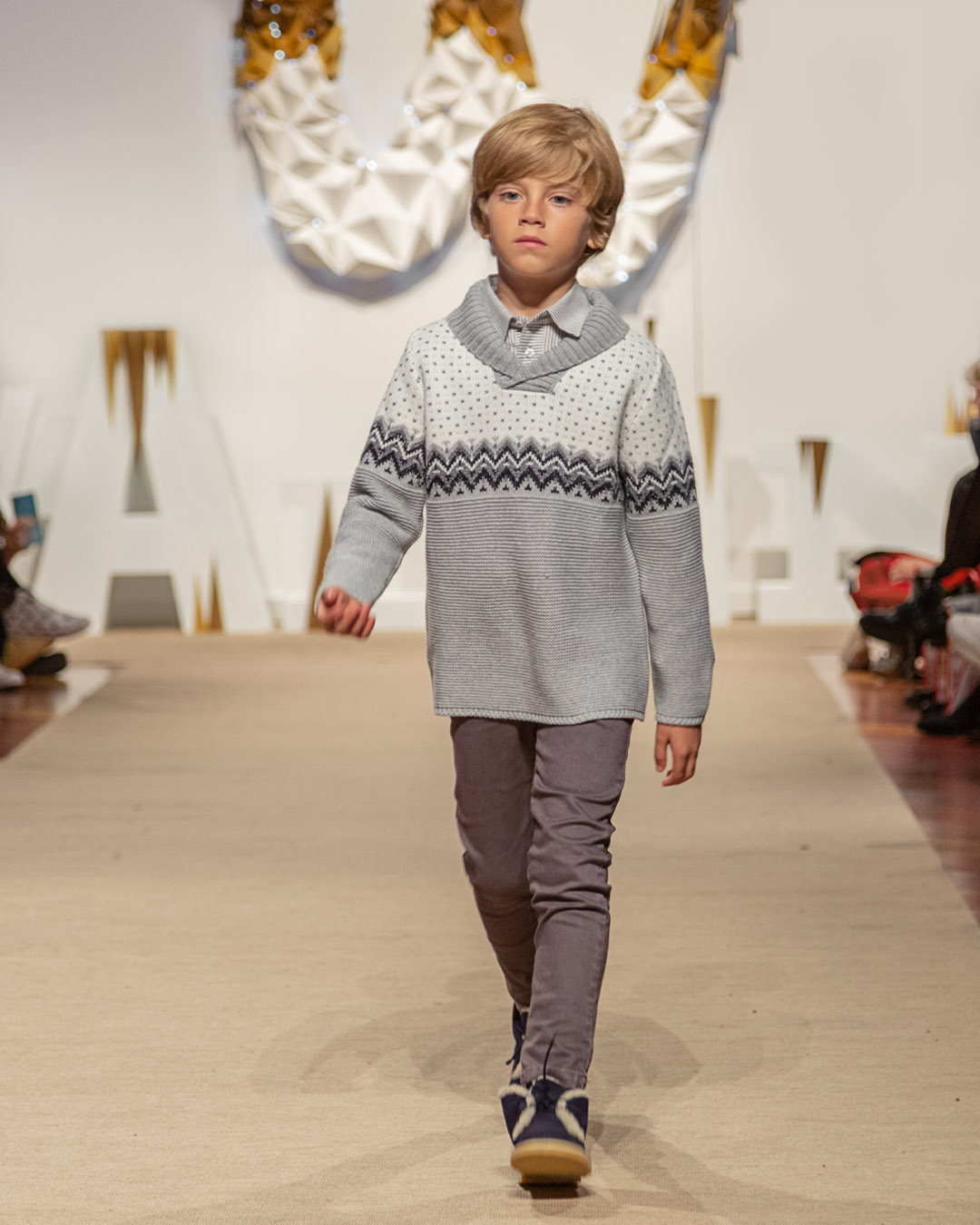 El quinto look que presentamos fue el conjunto compuesto por camisa de rayas, jersey y jeans gris oscuro con botas azul marino de Foque. A conjunto con el look de niña. Lucas Yago desfiló con este look de Foque.