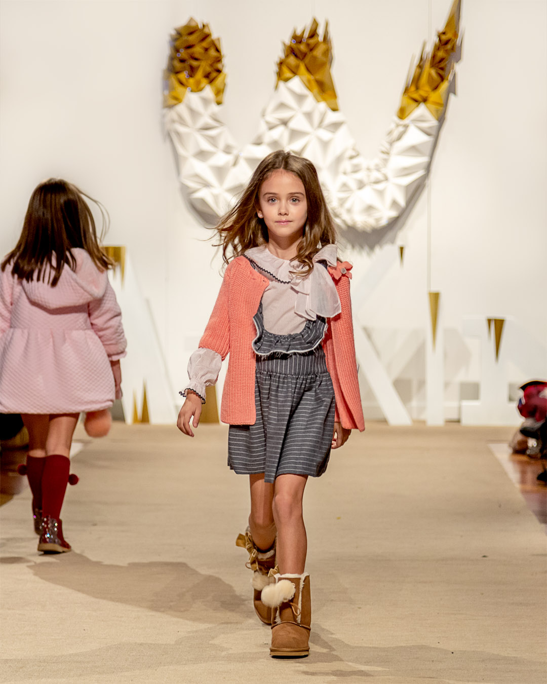 El cuarto look que desfiló fue el conjunto compuesto por camisa topitos coral con lazada lateral y falda tirantes cruzados rayas gris oscuro, chaqueta punto perlado rosa con botas de serraje camel de Foque. Anía Guijarro desfiló con este look que podéis encontrar en este enlace: Conjunto Niña Camisa Topitos Rosa & Falda Tirantes Cruzados Rayas Gris