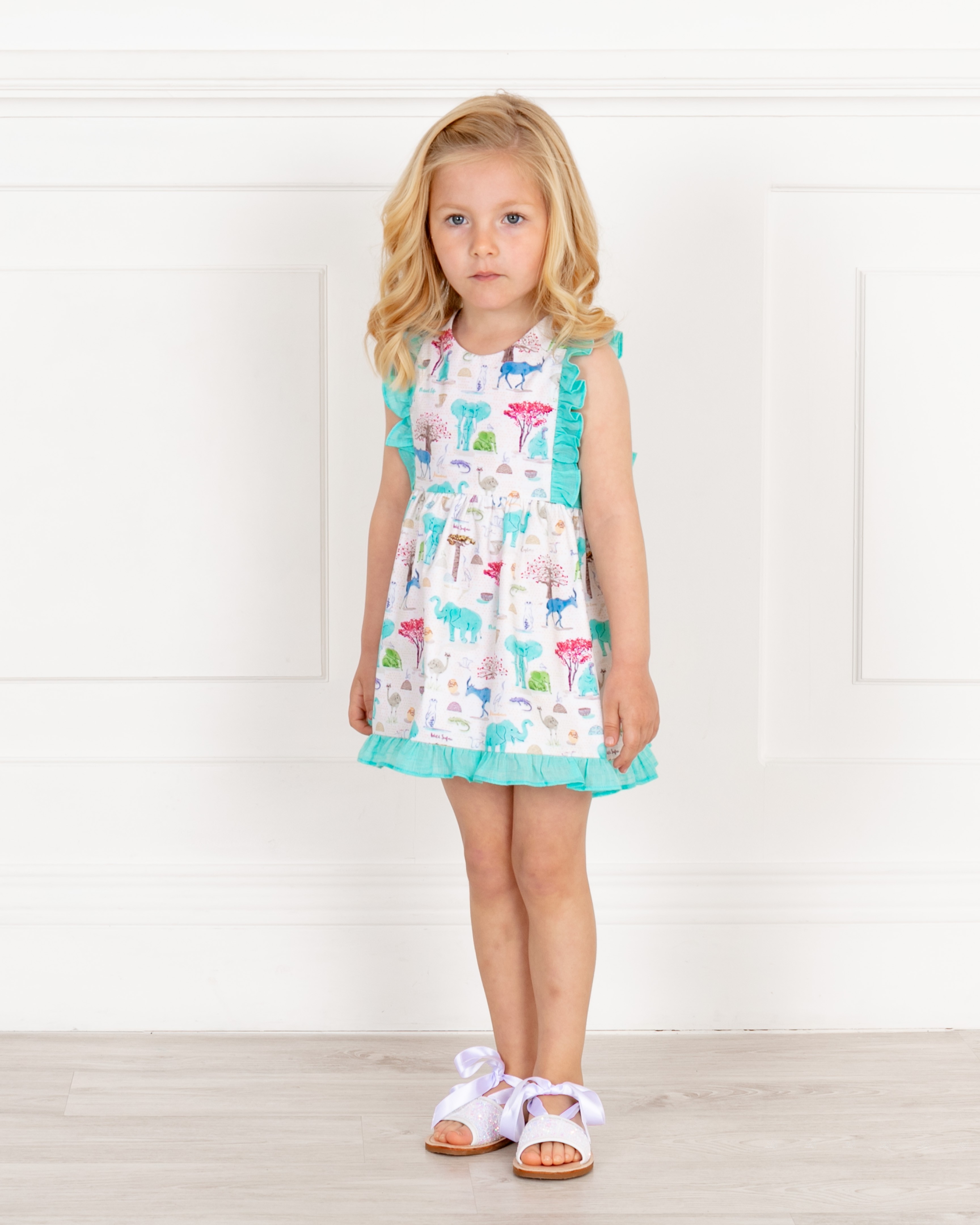 Ancar Spring- Summer 2019 Collection. Baby girls aqua green animal print dress with ruffles.