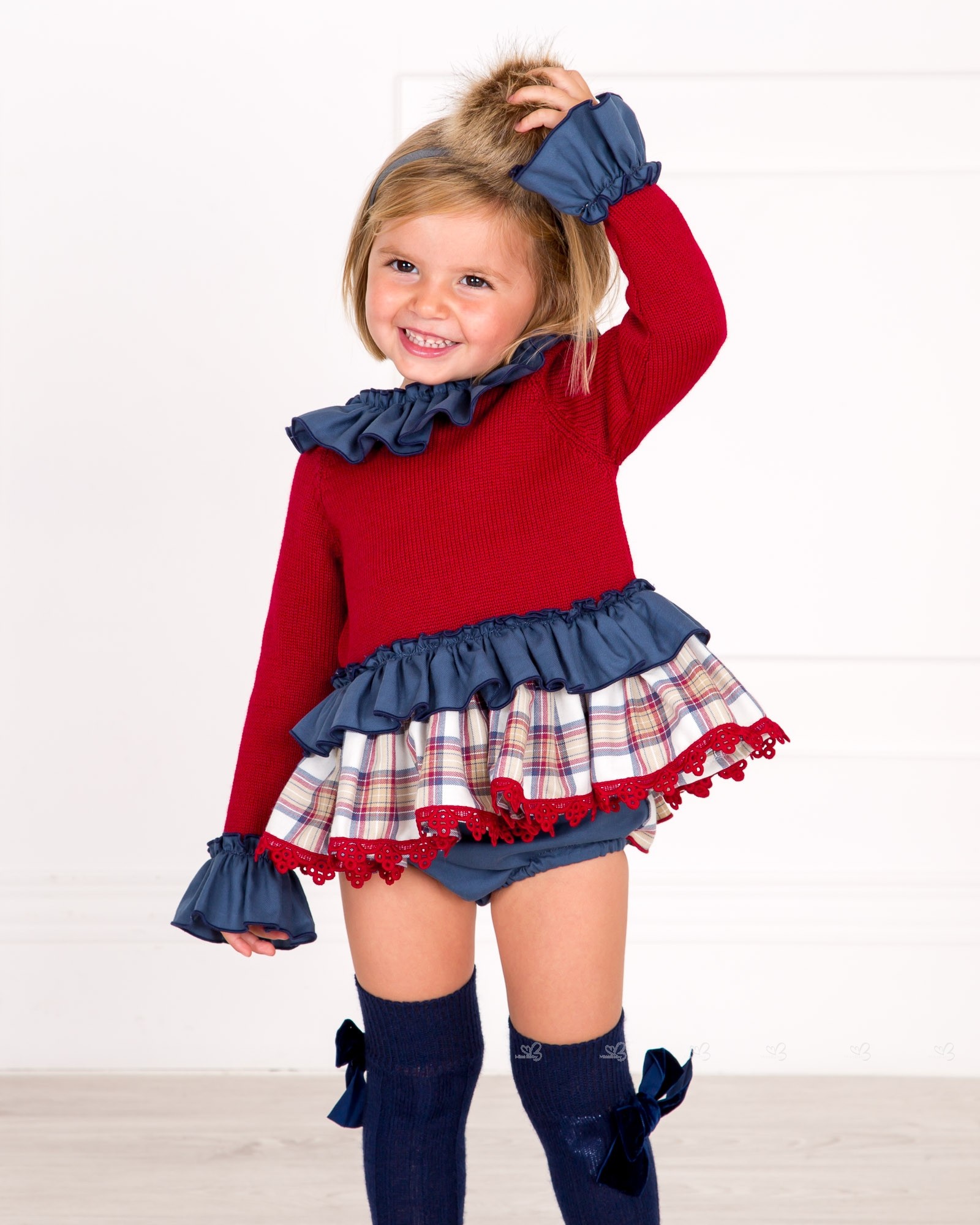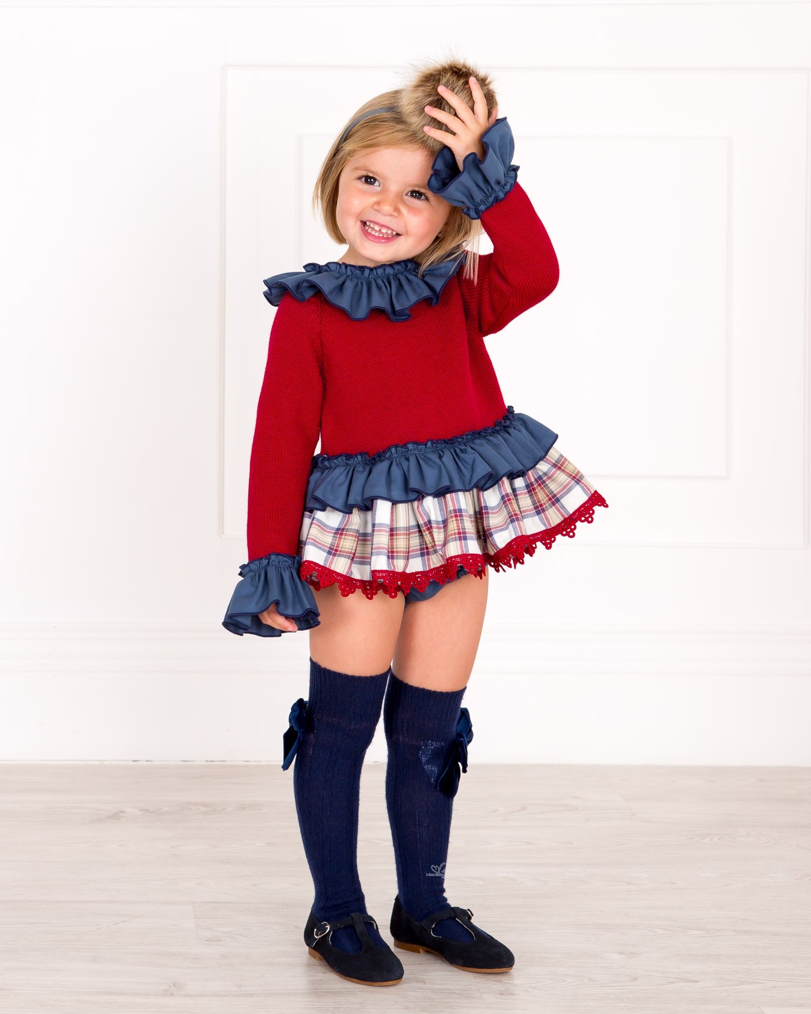 Marané Autumn-Winter 2018/19 Collection. Baby Girls burgundy and blue checked 2 piece sweater set.