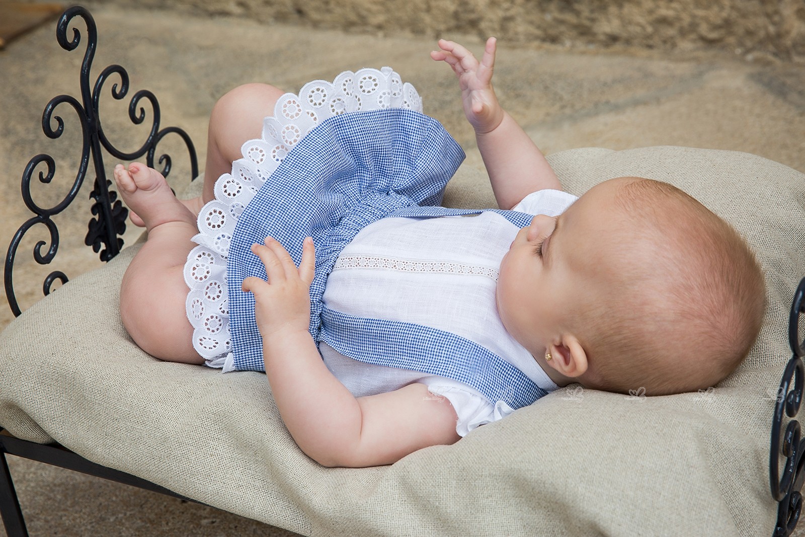 Rochy Spring-Summer 2018 Collection. Baby girls ivory linen shirt and blue flower print gingham shorts set.