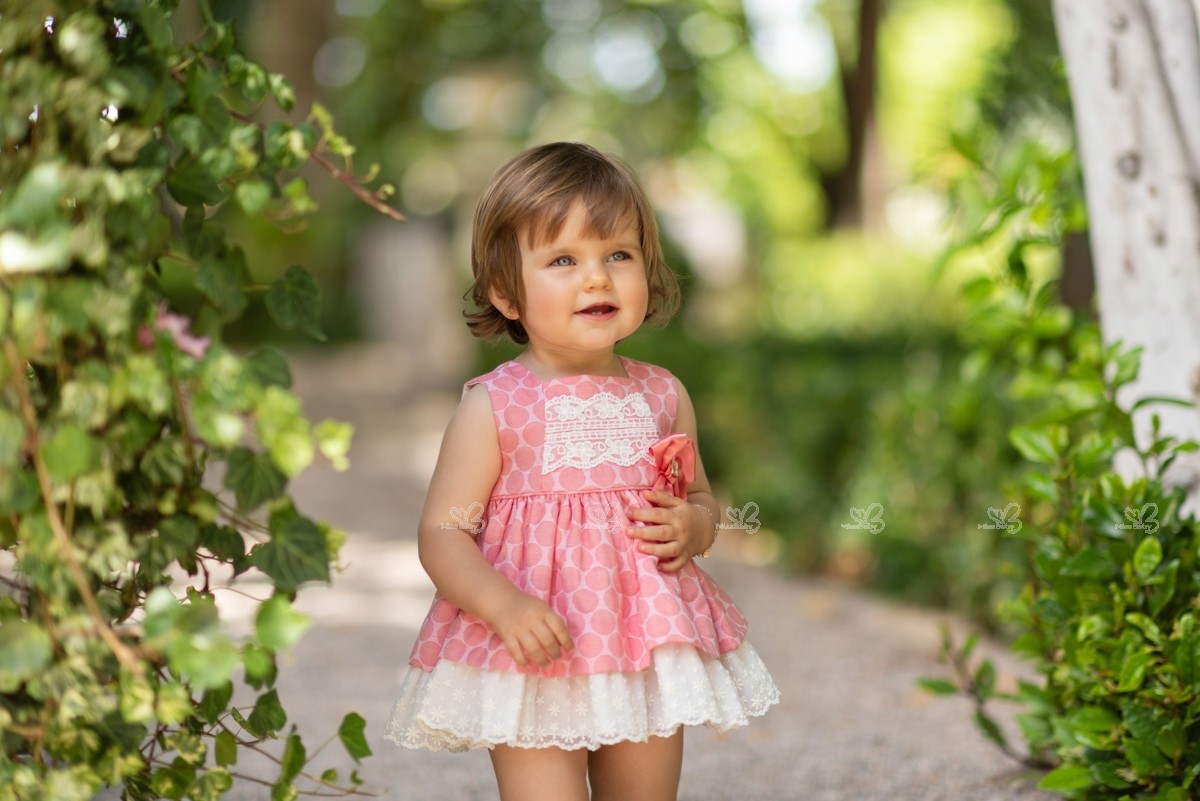 Dolce Petit Spring-Summer 2019 Collection. Baby girls pink and ivory jacquard spotted 2 pieces dress set.