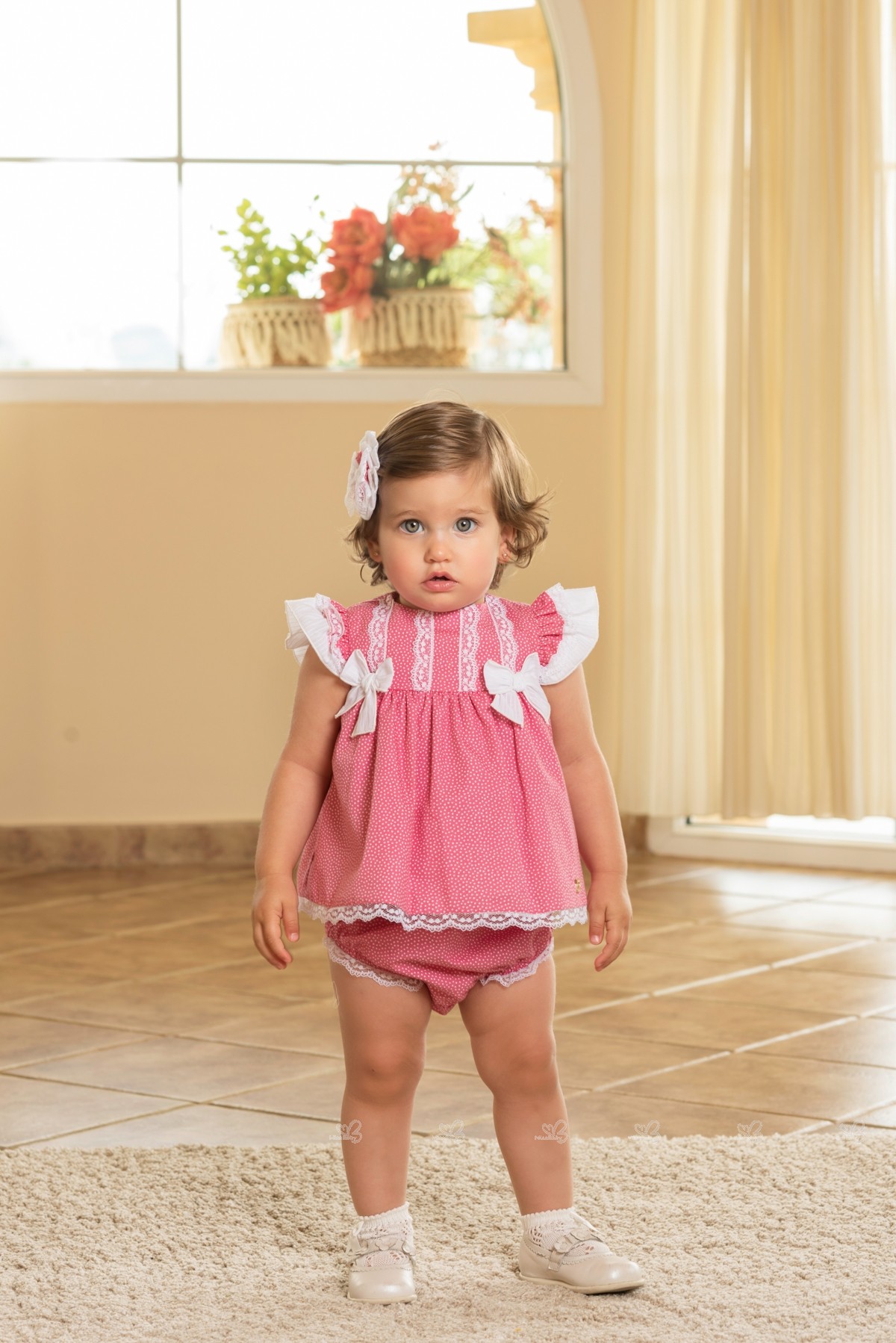 Dolce Petit Spring-Summer 2019 Collection. Baby girls pink and white 2 piece dress set.