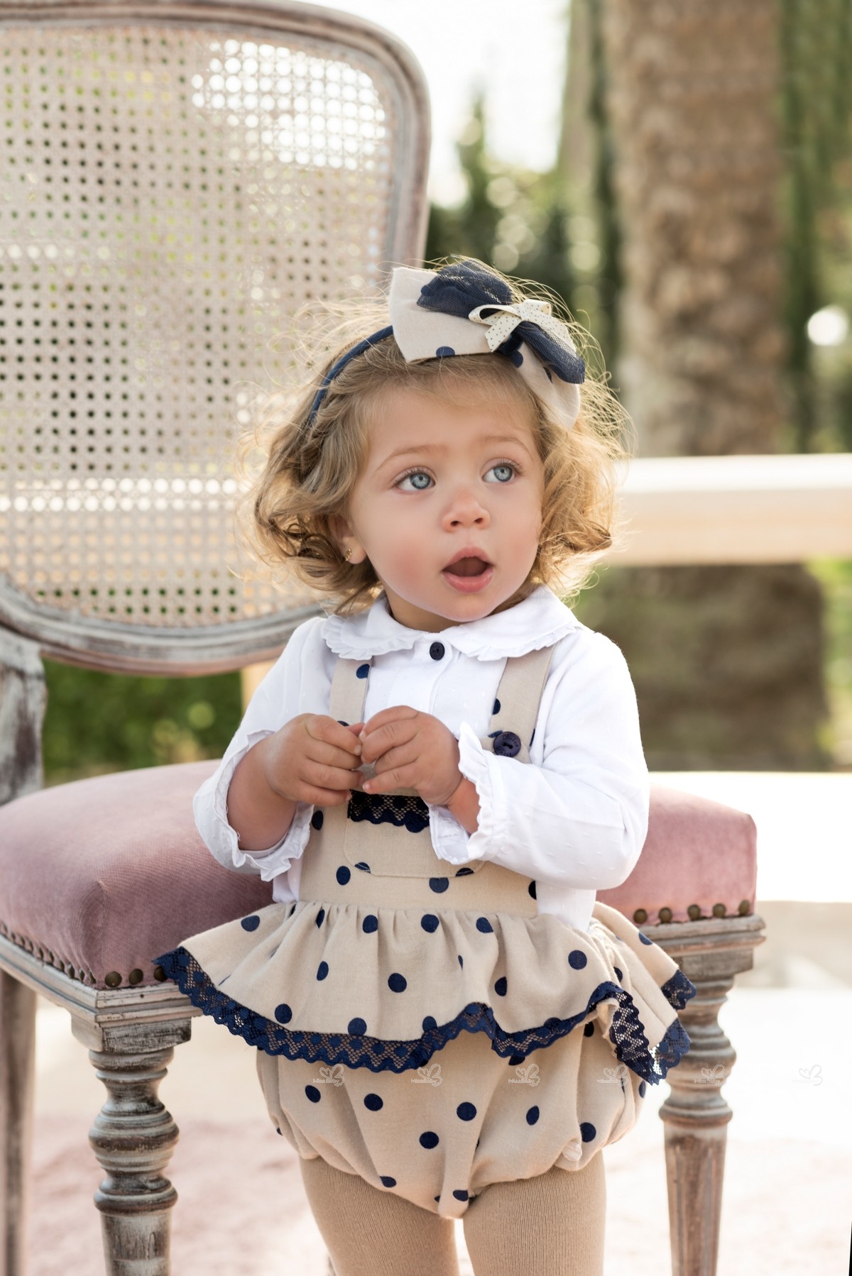 Dolce Petit Autumn-Winter 2018/19 Collection. Baby girls white blouse and beige polka dungaree shortie set.