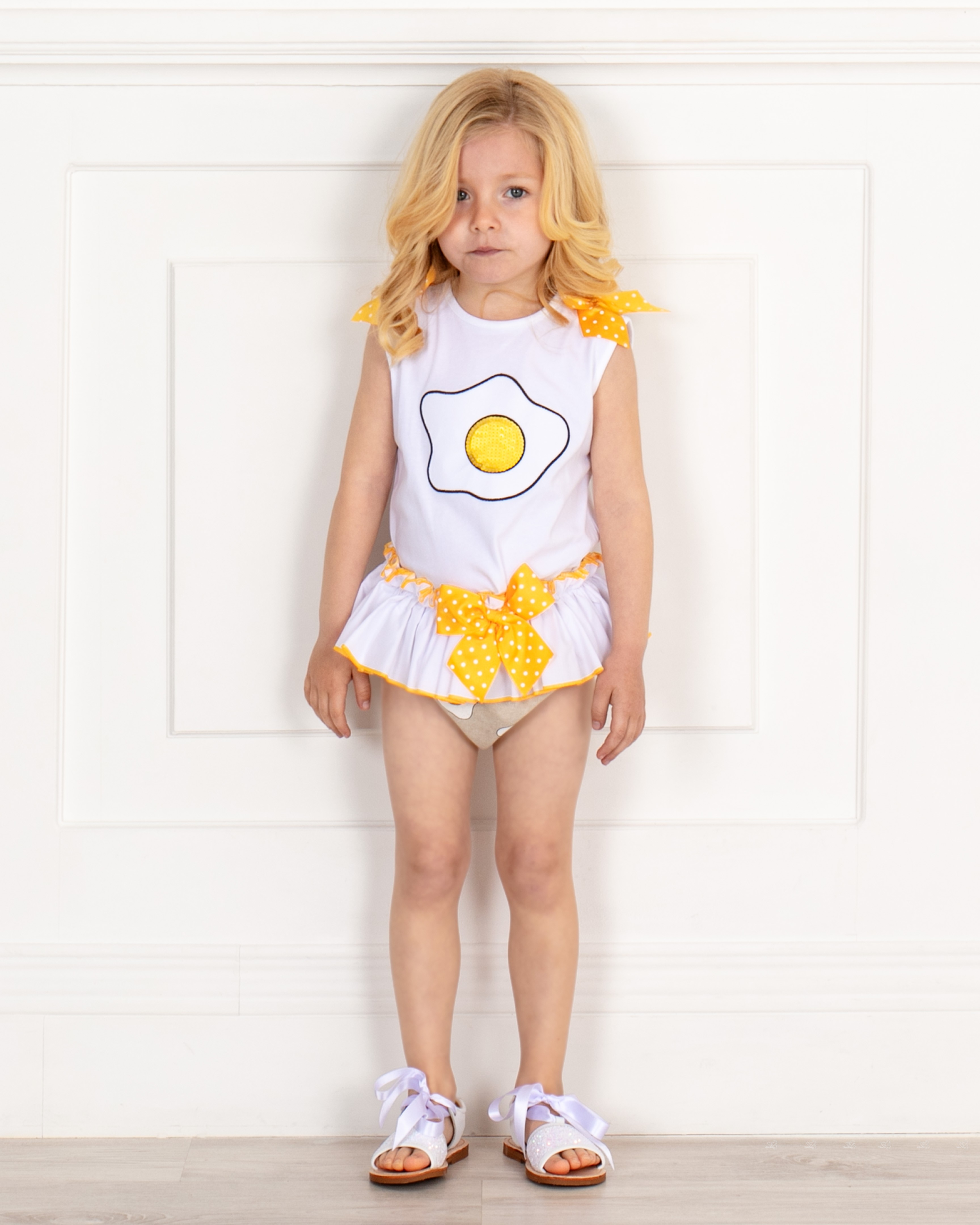 Nini Moda Infantil Spring-Summer 2019 Collection. Baby girlsyellow and beige fried eggs 2 piece ruffle knickers set.