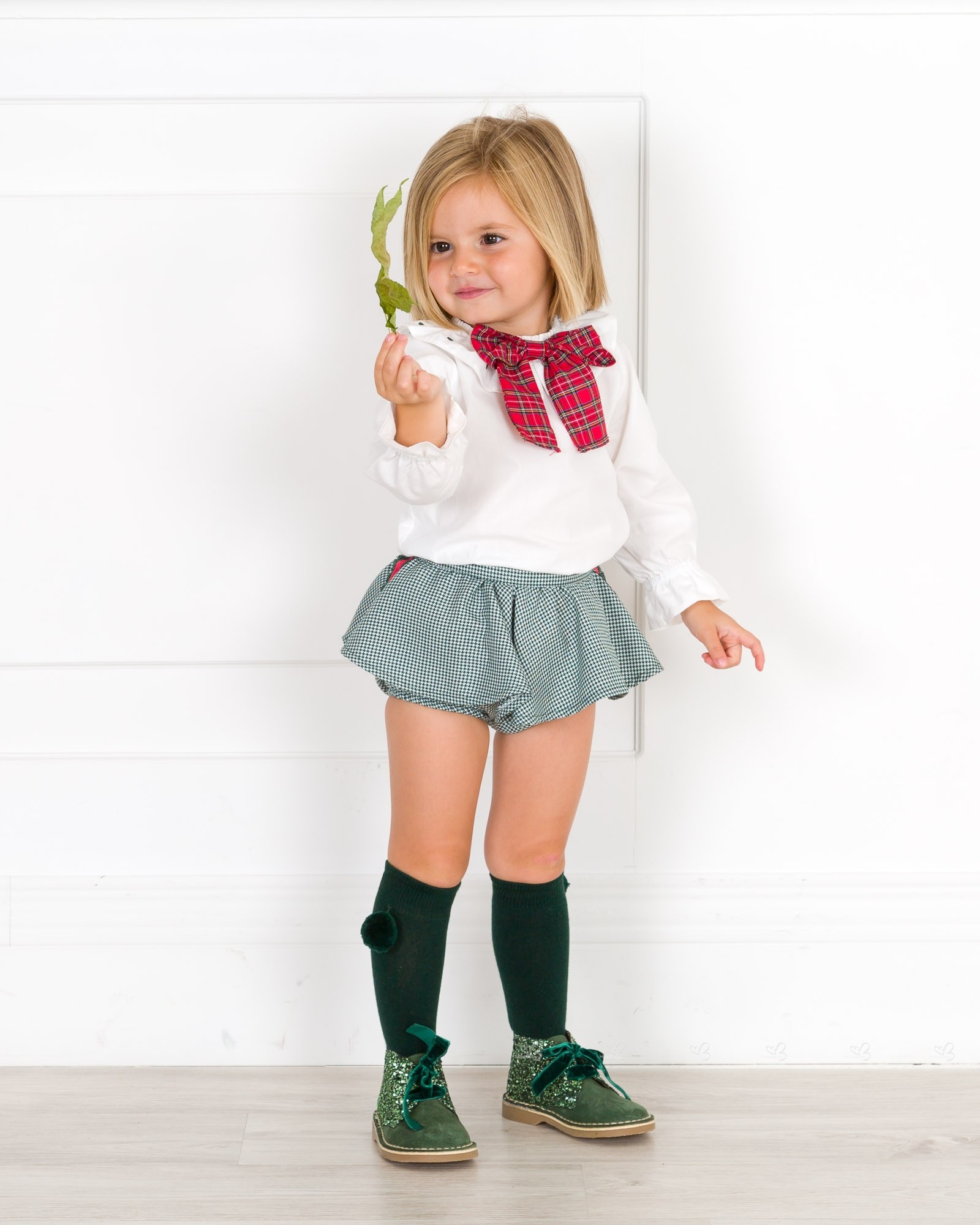 Baby Ivory Blouse & Green Ruffle Shorts Set & Red Knitted Cardigan Outfit
