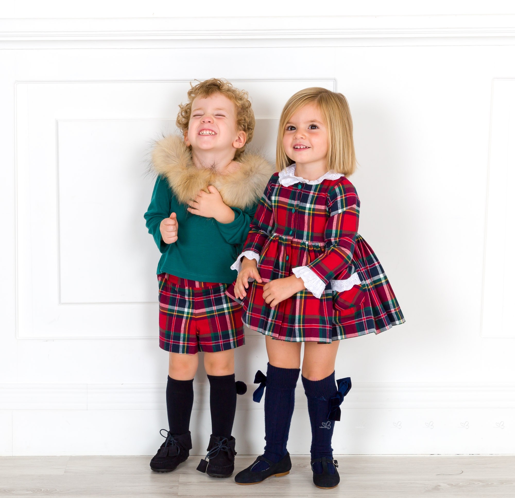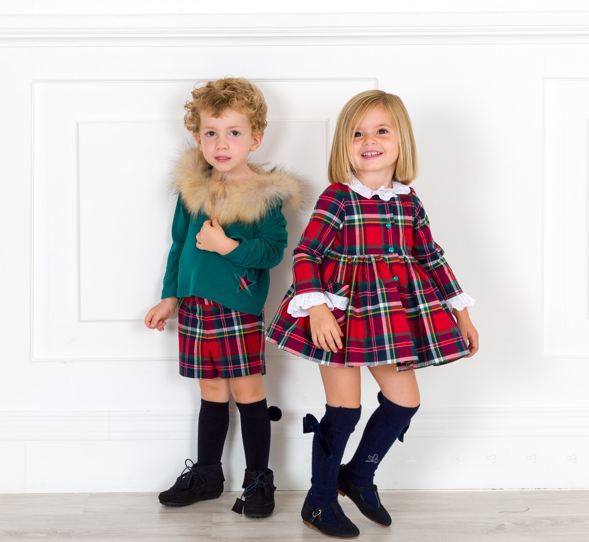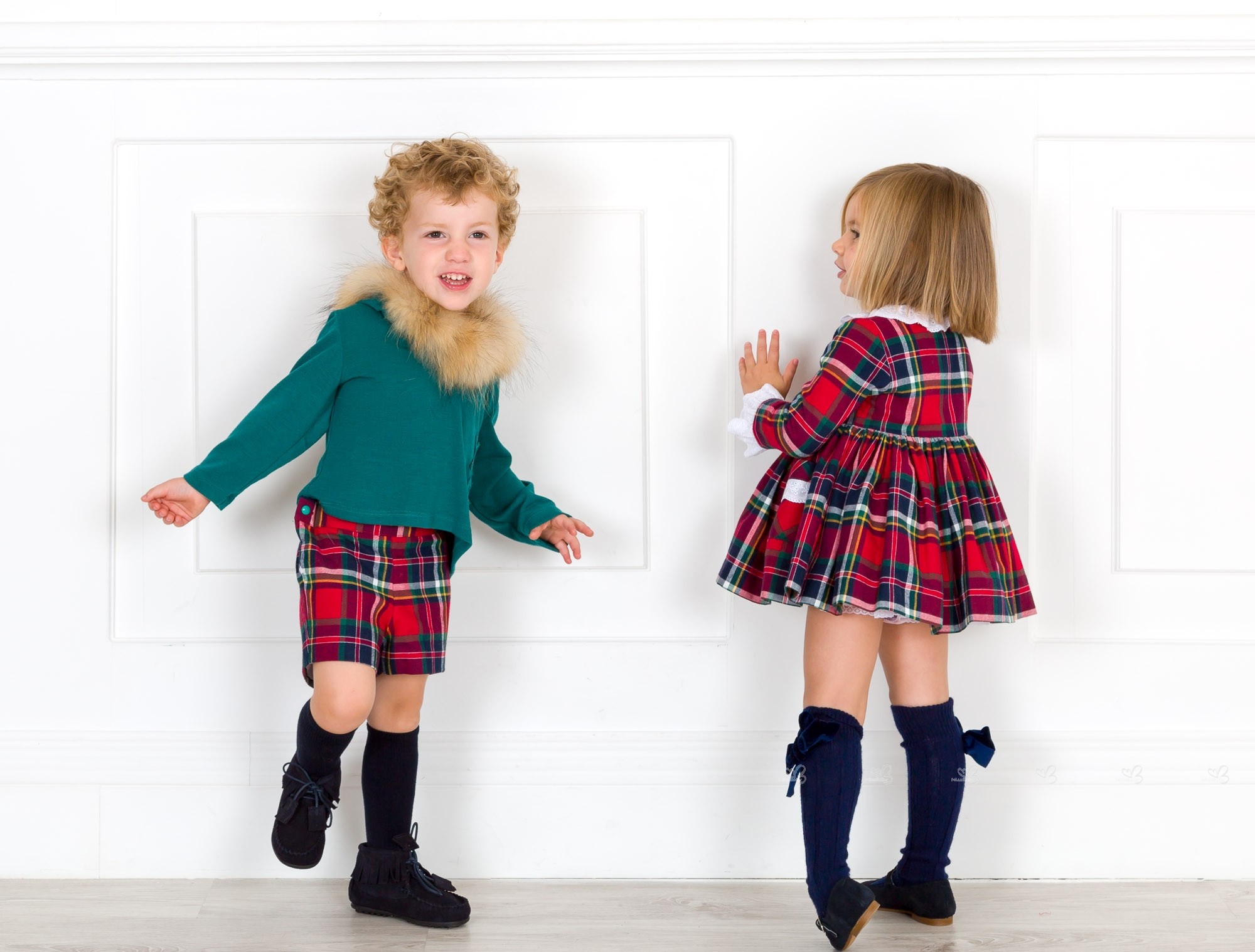 Lapeppa Moda Infantil Autumn-Winter 2018/19 Collection. Boys green fur hood sweater with and red checked shorts set.