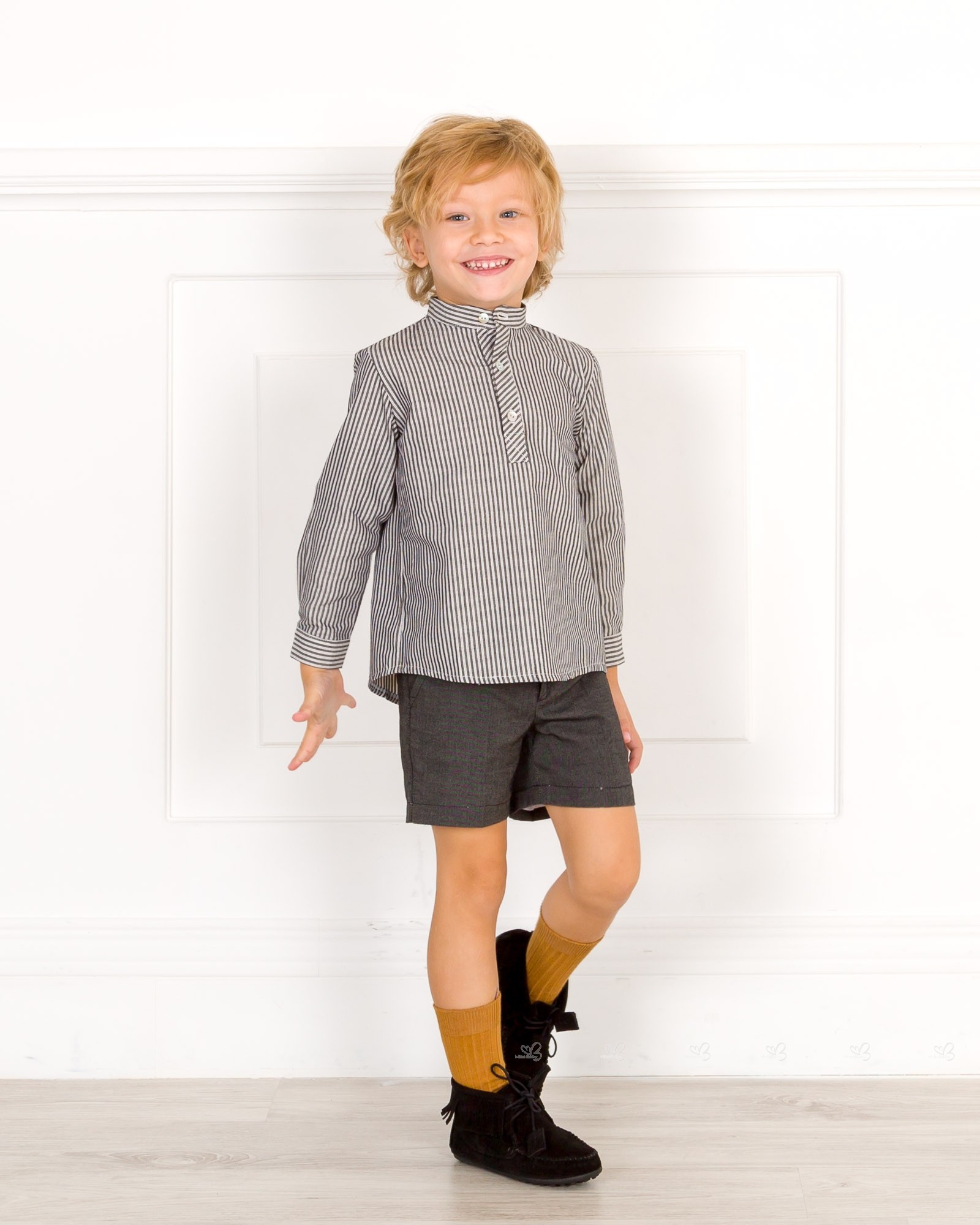 Manuela Montero Autumn-Winter 2018/19 Collection. Boys grey striped shirt and shorts set.