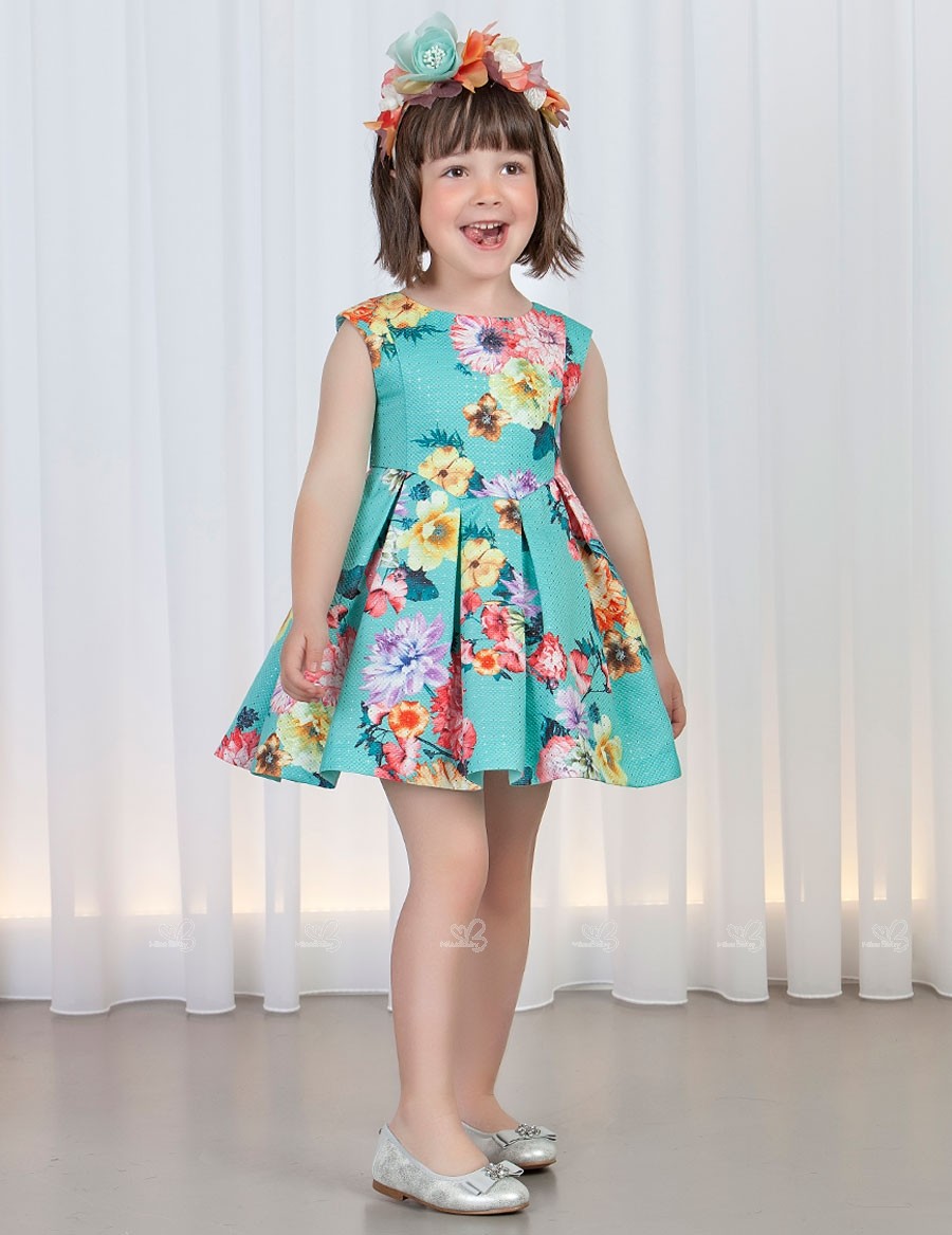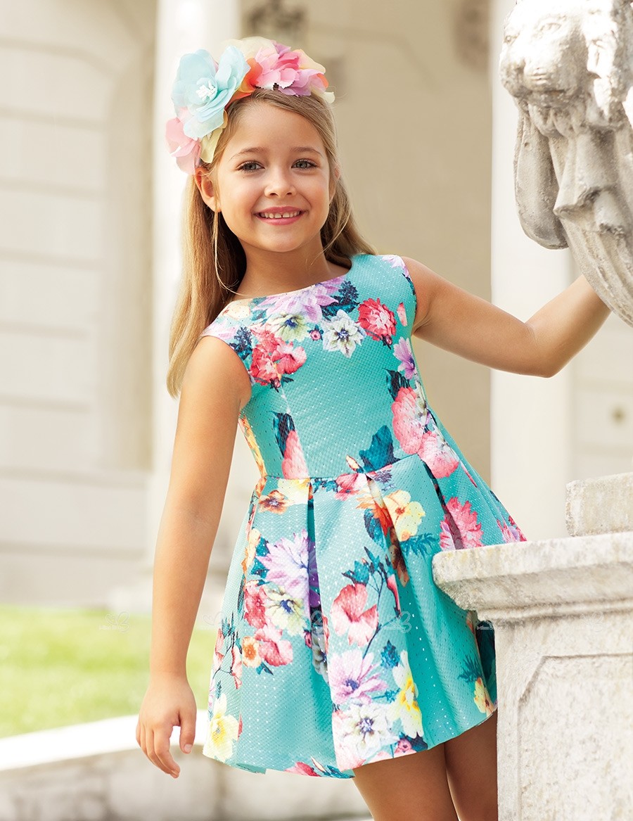 Abel & Lula Spring-Summer 2019 Collection. Girls aquamarine floral print brocade pleated dress.