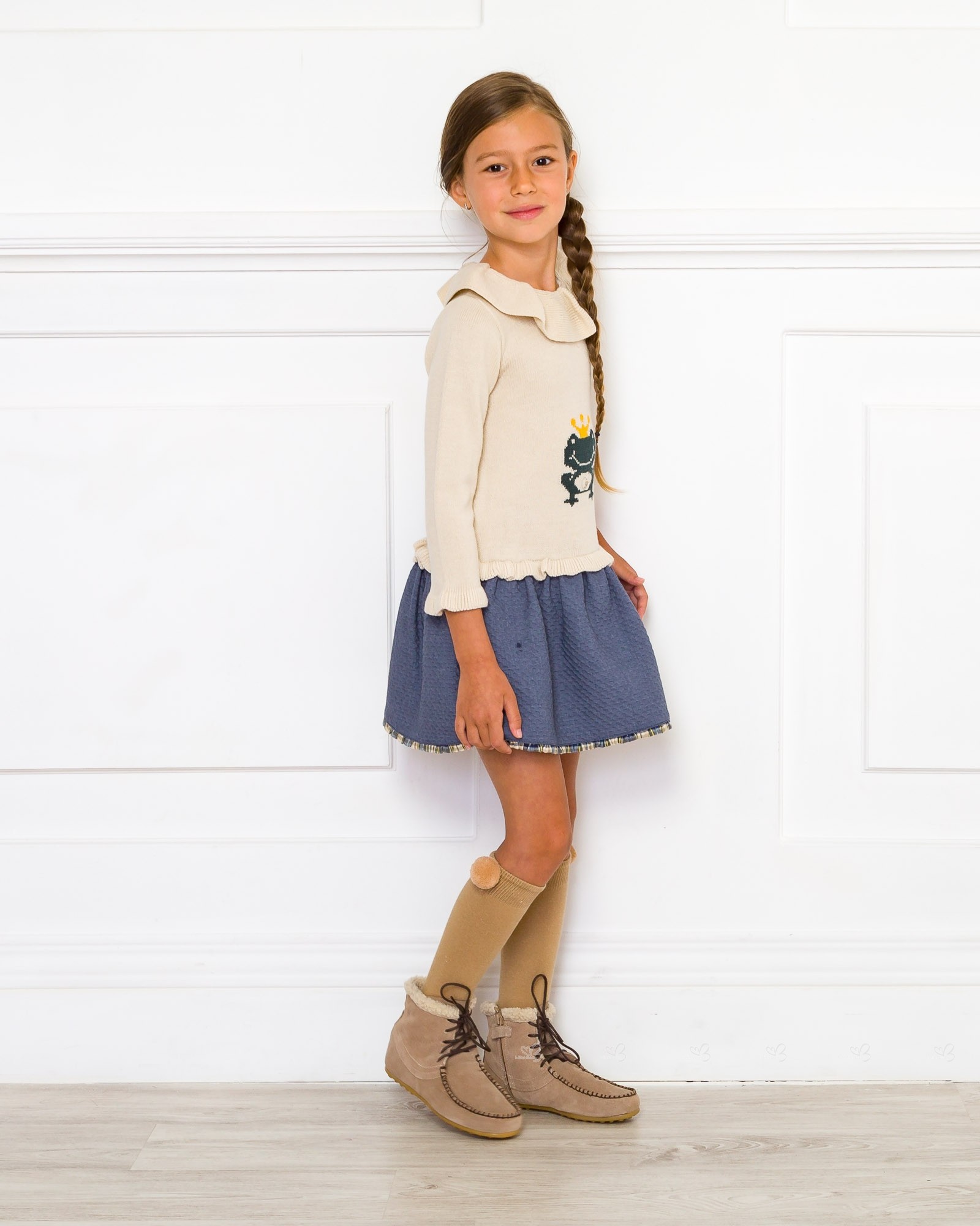Girls Beige & Blue Frog Dress Outfit