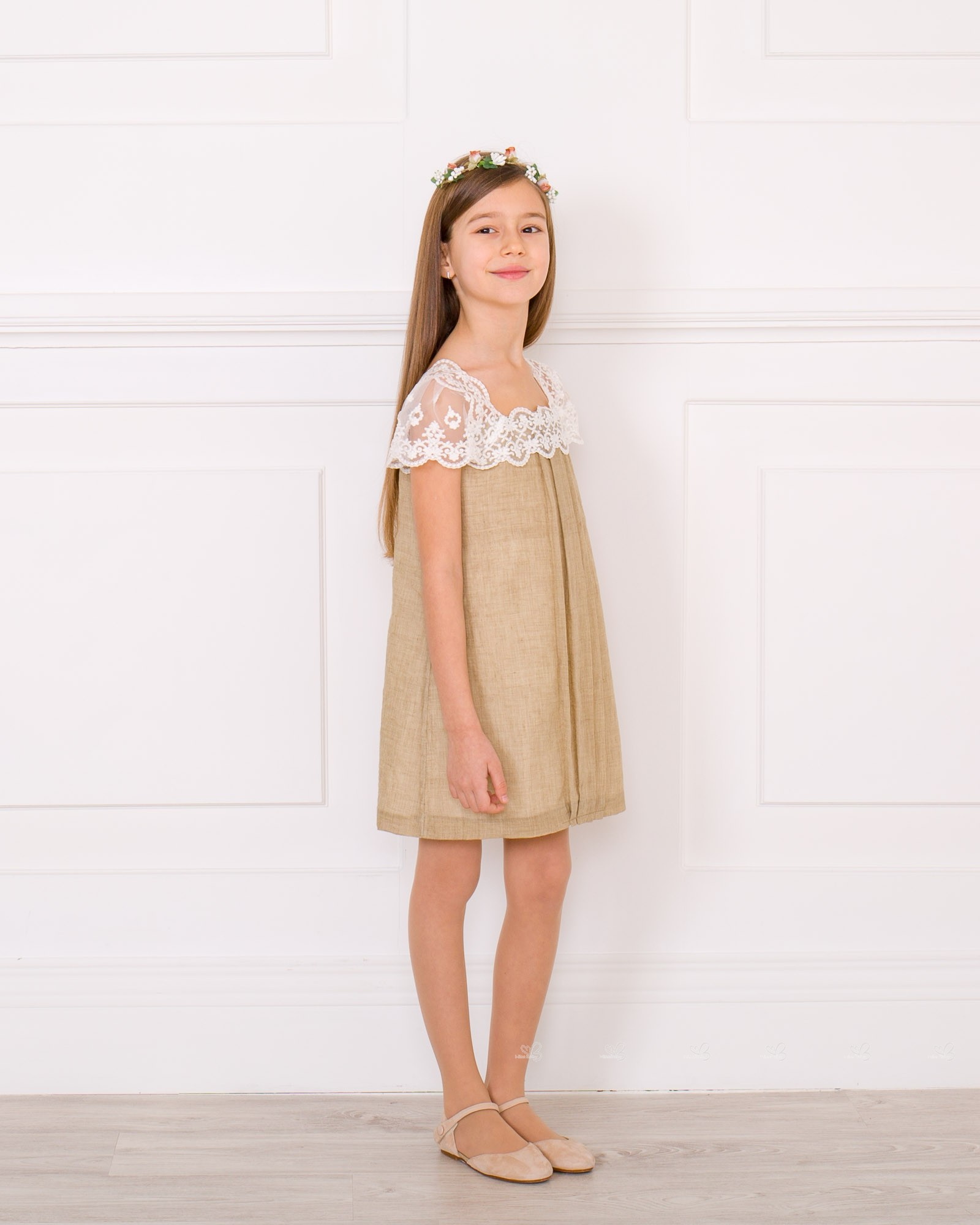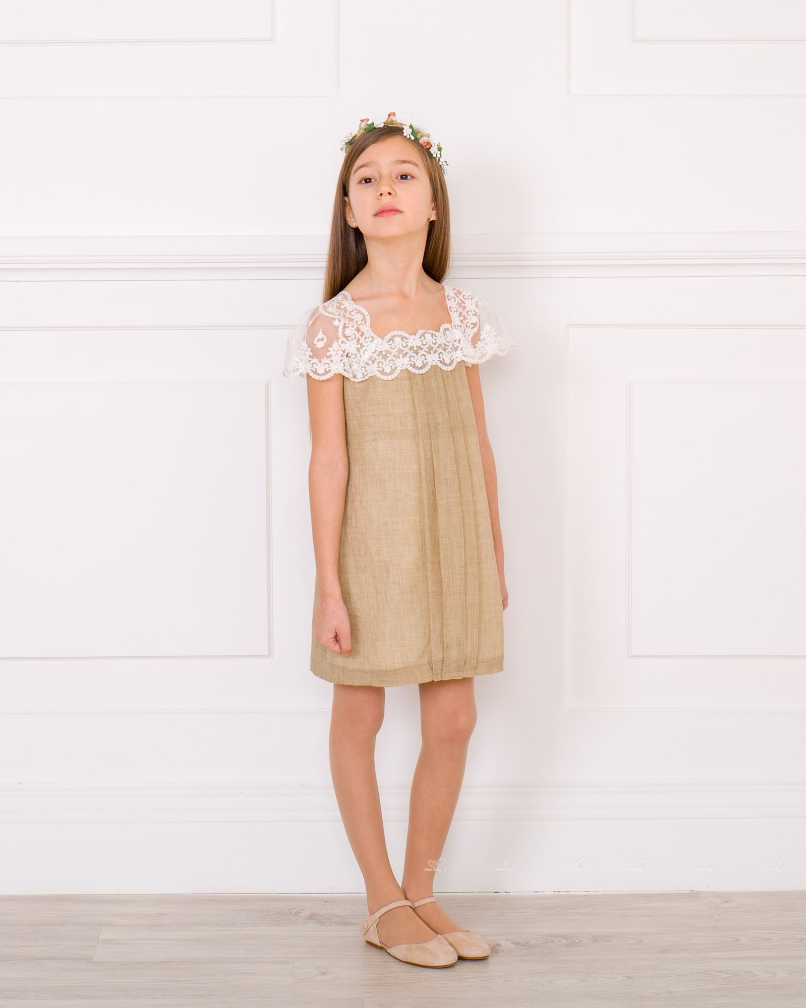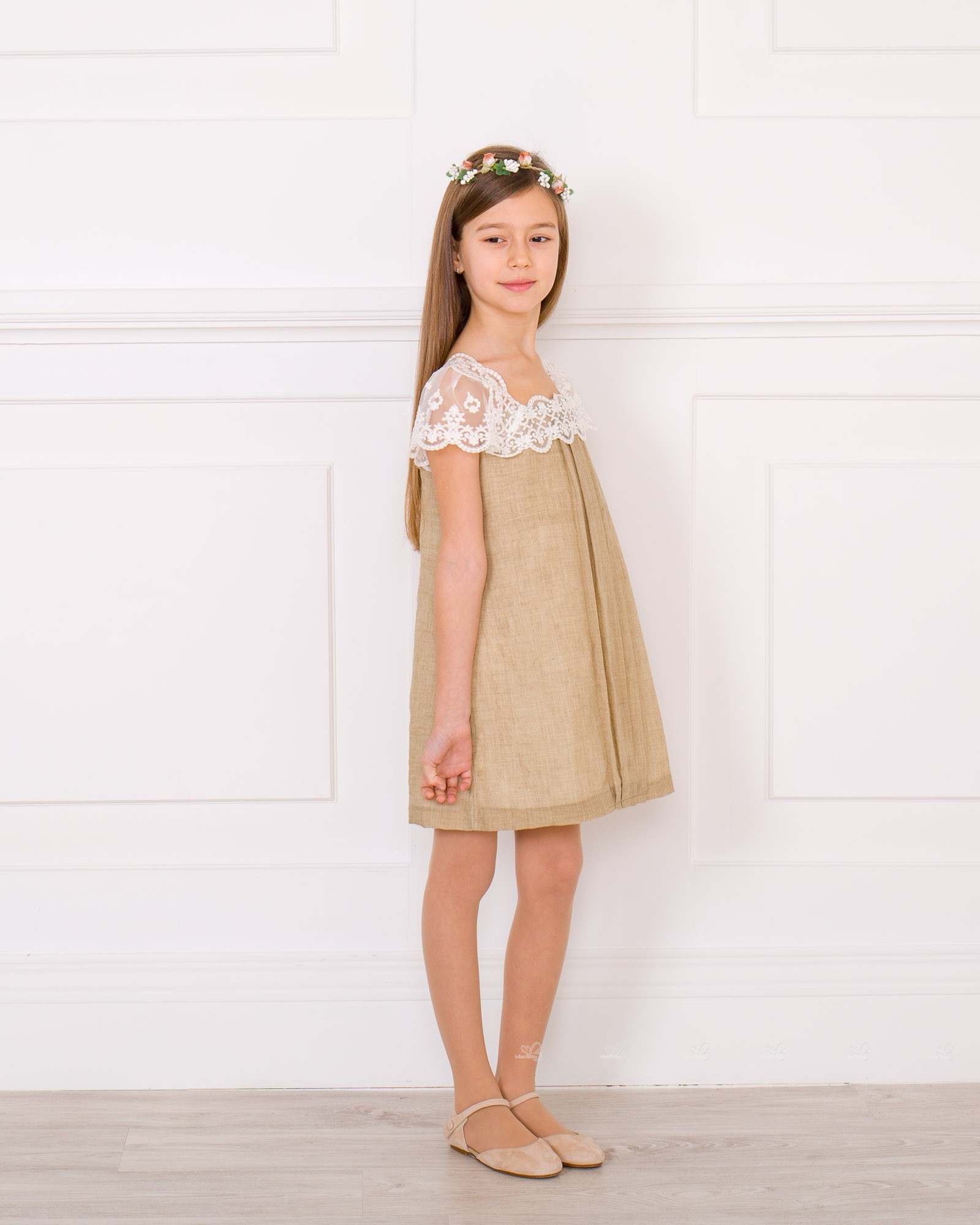 Nueces Kids Spring-Summer 2018 Collection. Girls beige and ivory muslin dress with lace necklace.