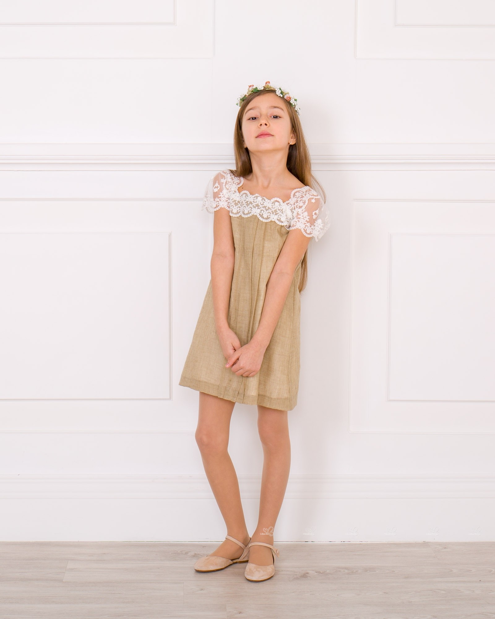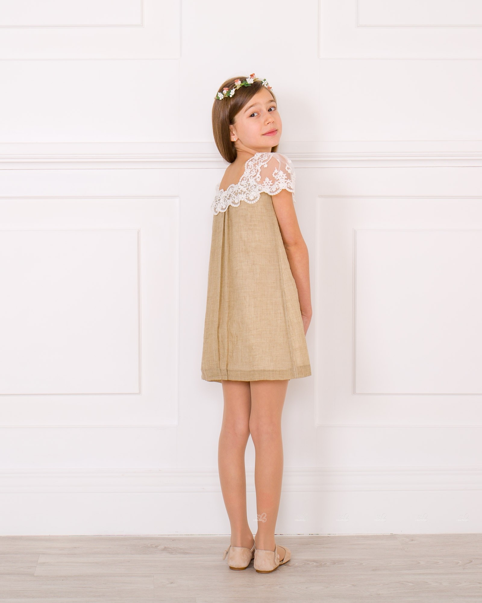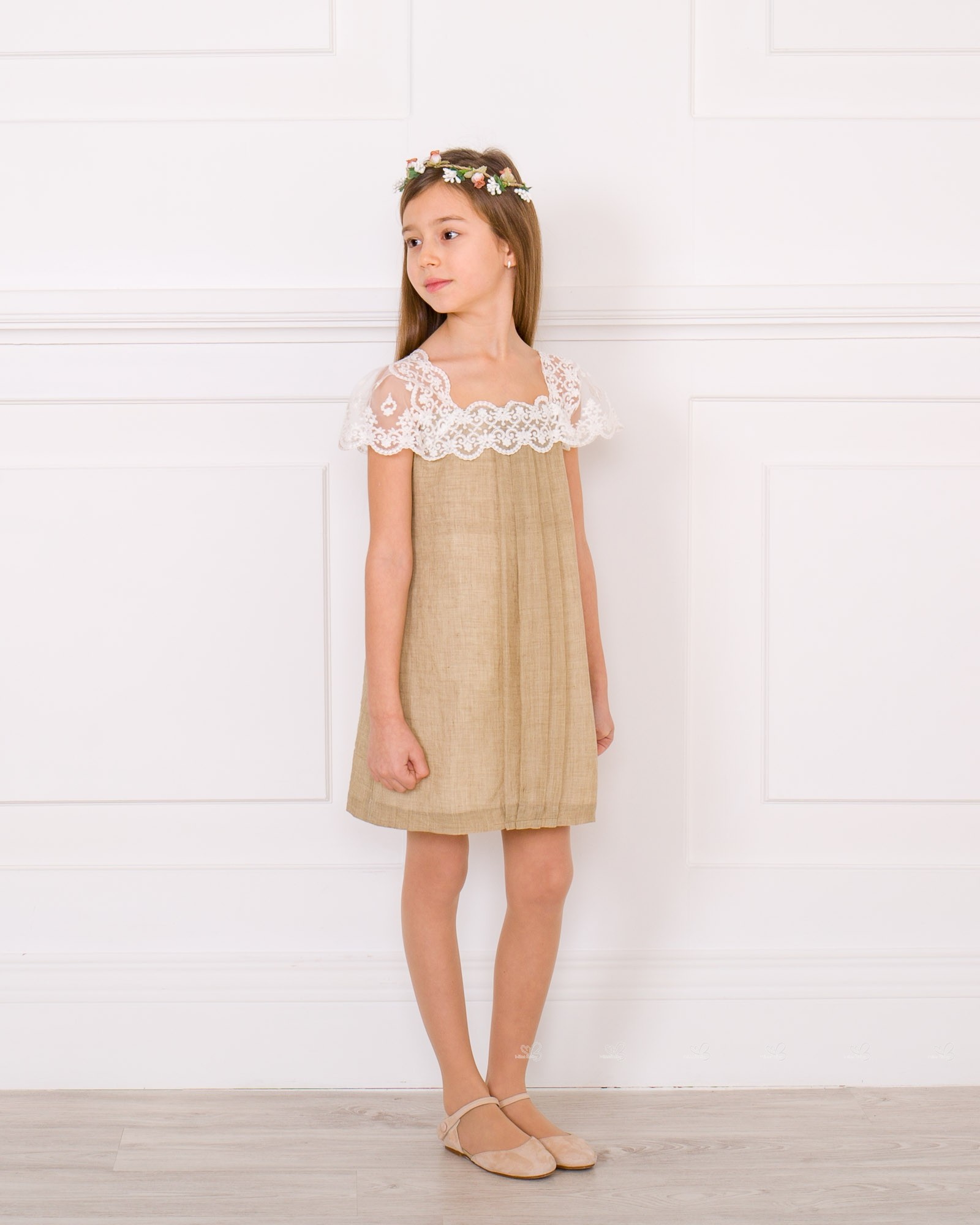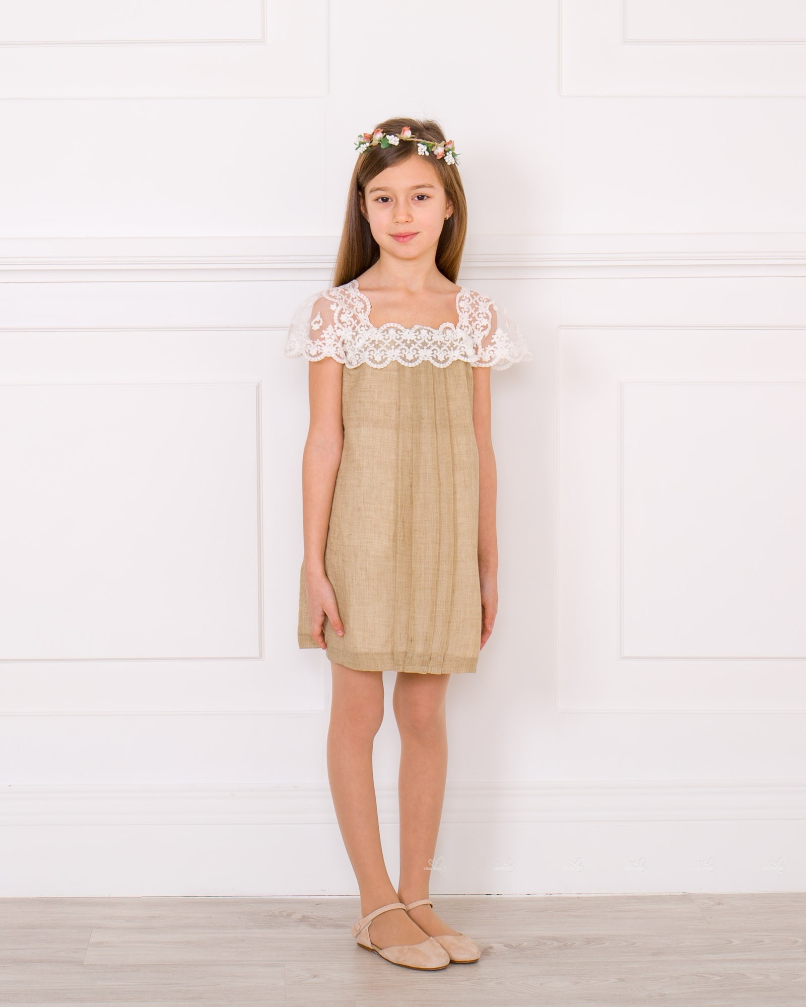 Nueces Kids Spring-Summer 2018 Collection. Girls beige and ivory muslin dress with lace necklace.