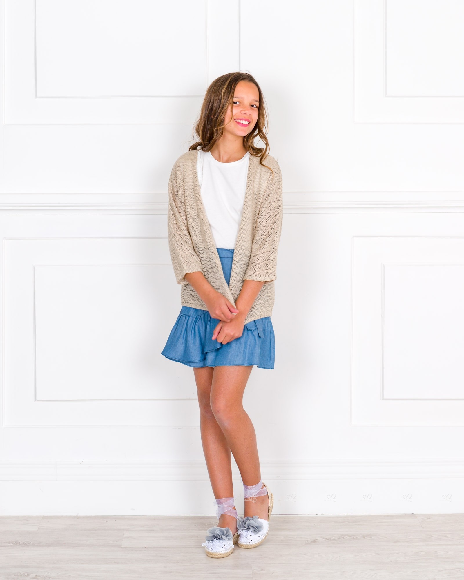 Manuela Montero Spring Summer 2018 Collection. Girls beige knitted cardigan.