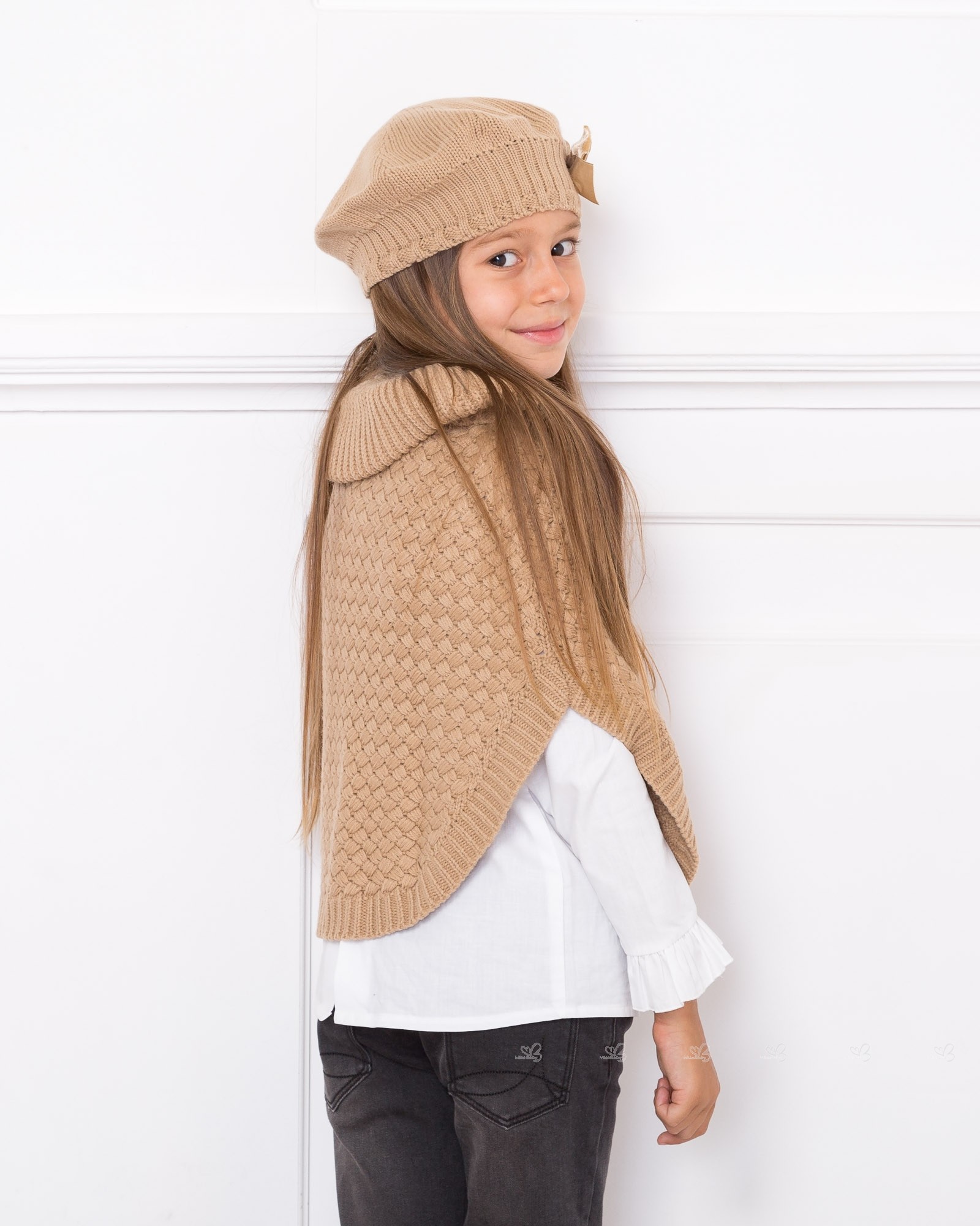 Girls Beige Knitted Wide Polo-Neck Poncho