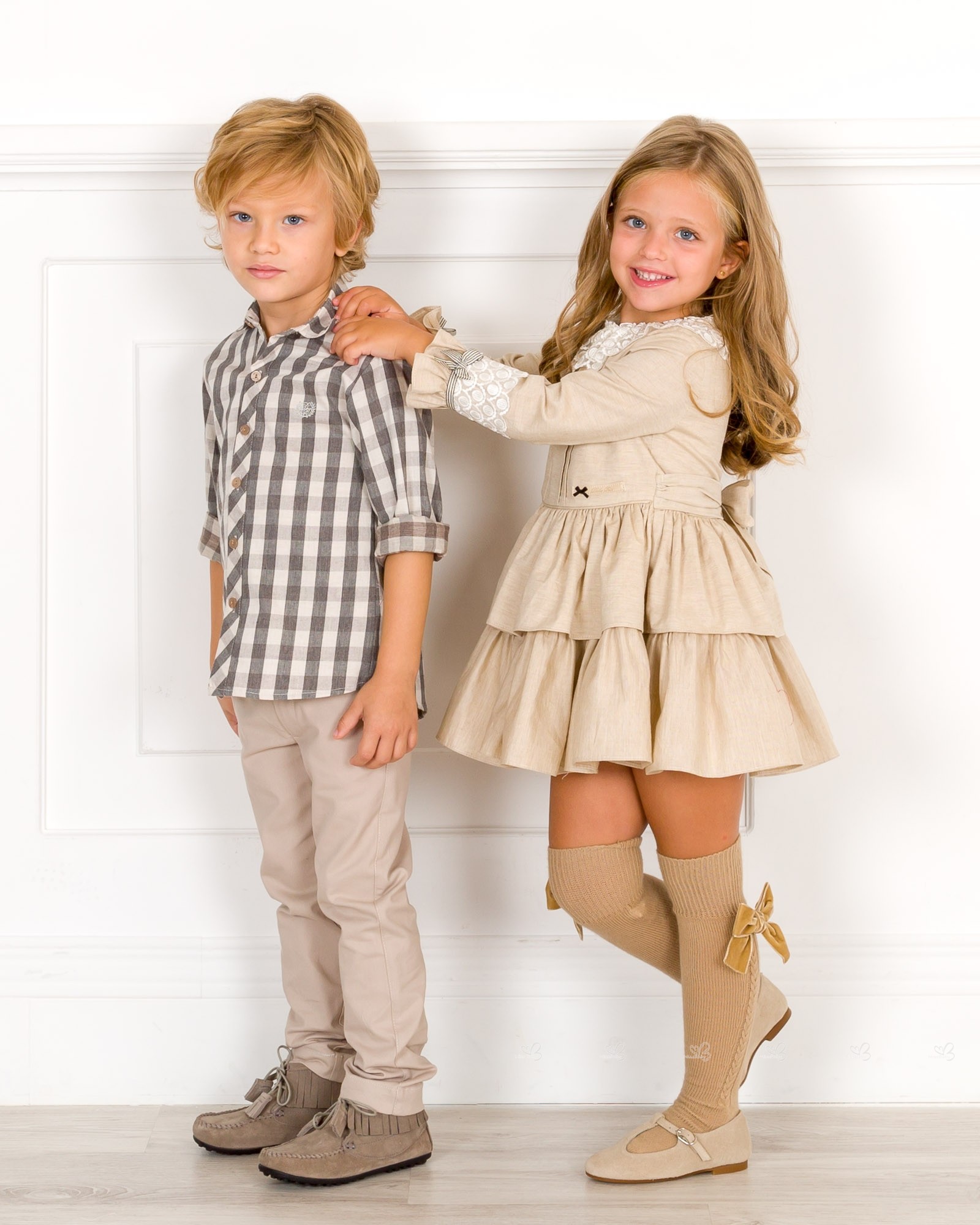 Dolce Petit Autumn-Winter 2018/19 Collection. Girls beige ruffle layered dress with ivory lace collar.