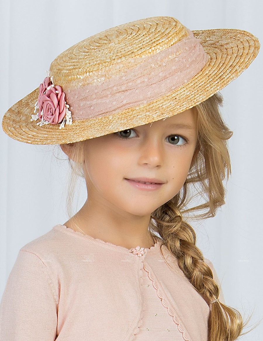 Abel & Lula Spring-Summer 2019 Collection. Girls beige straw hat with pink flowers Satin and tulle ribbon.