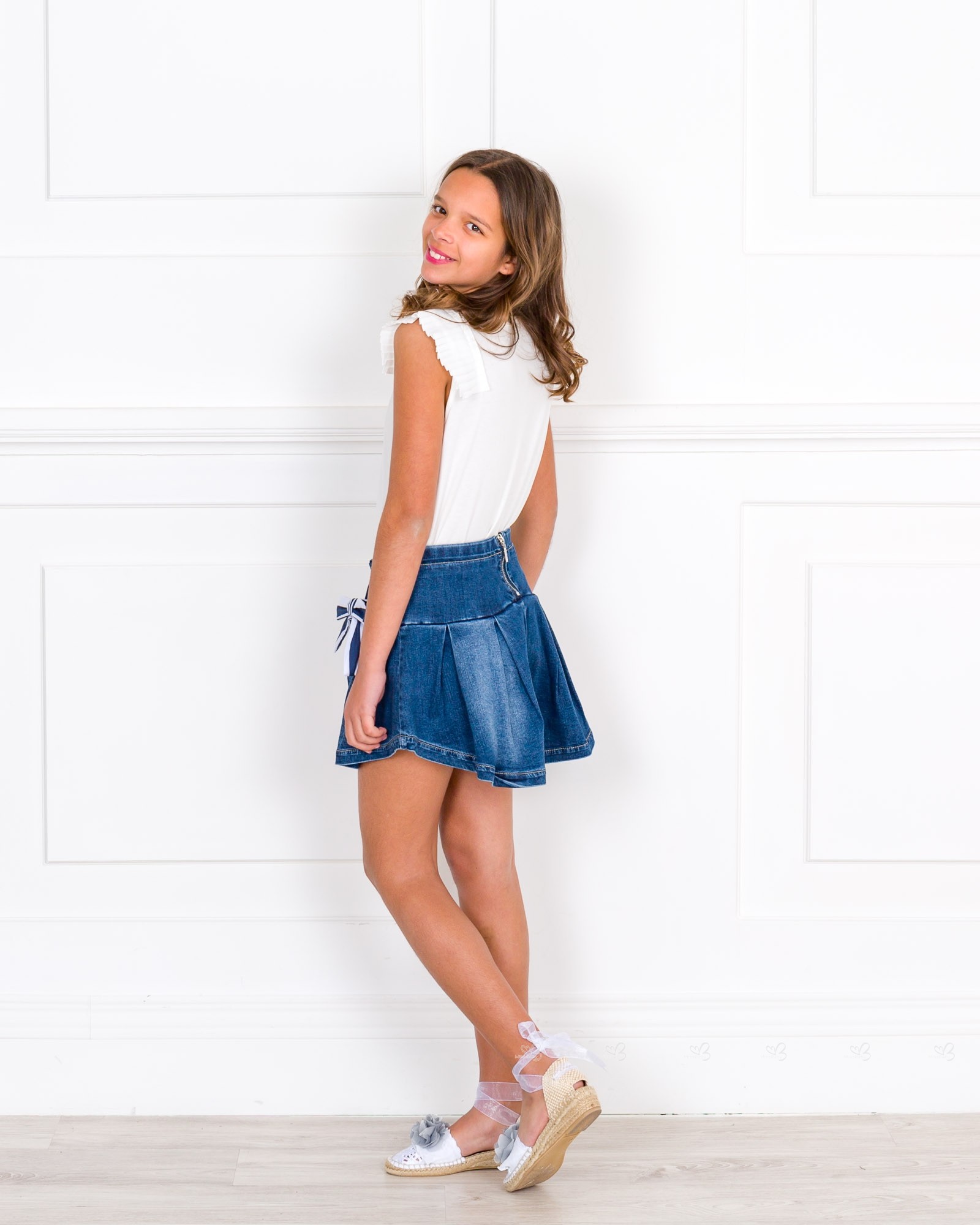 Byblos Spring-Summer 2018 Collection. Girls blue denim skort with navy blue and white trim belt.