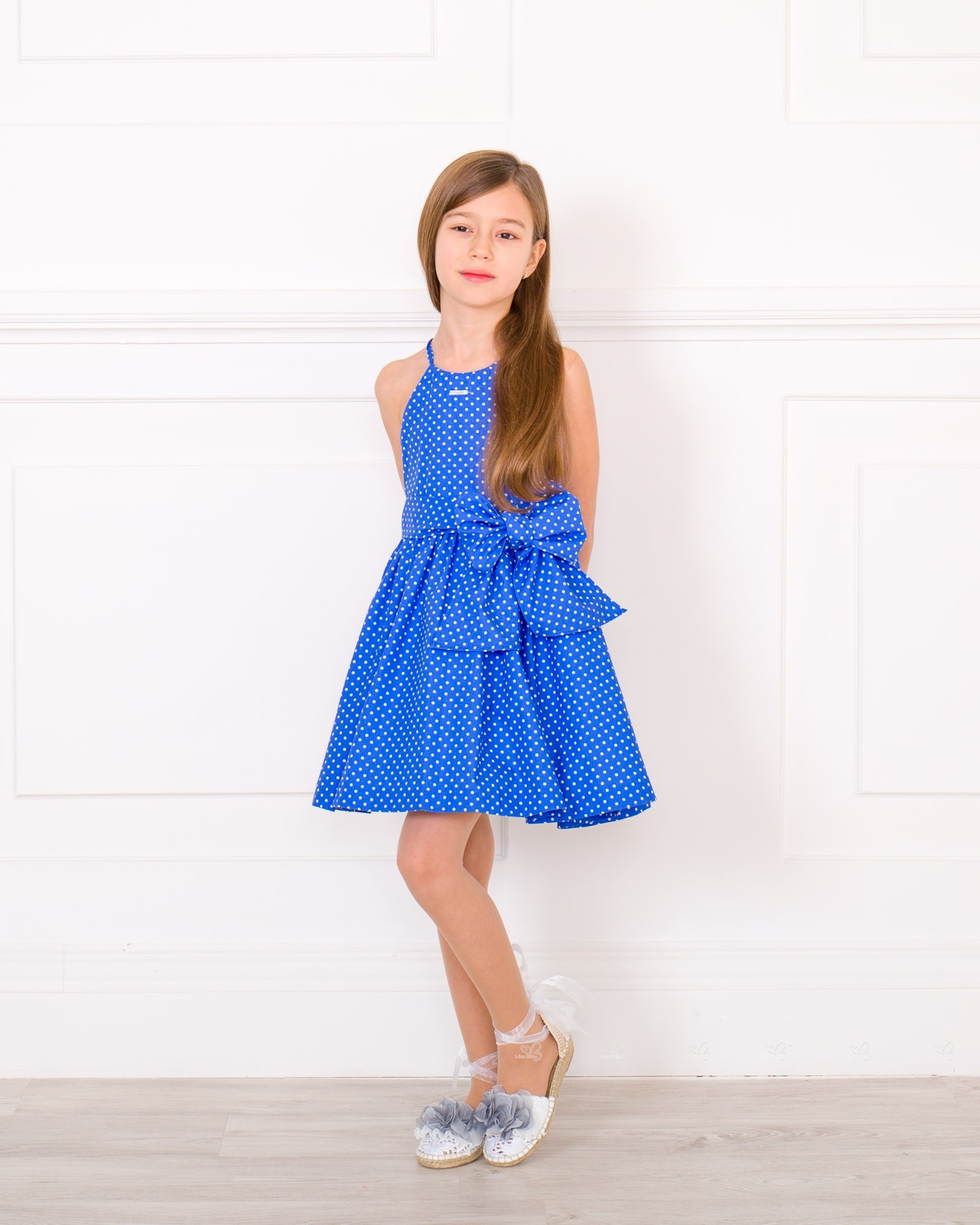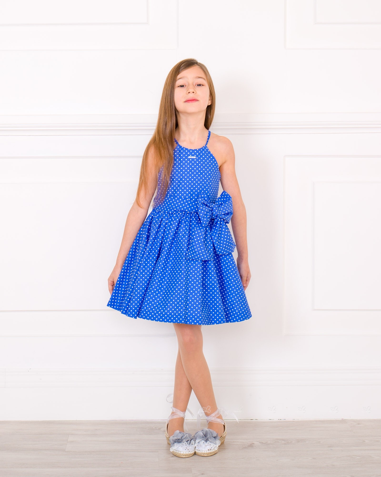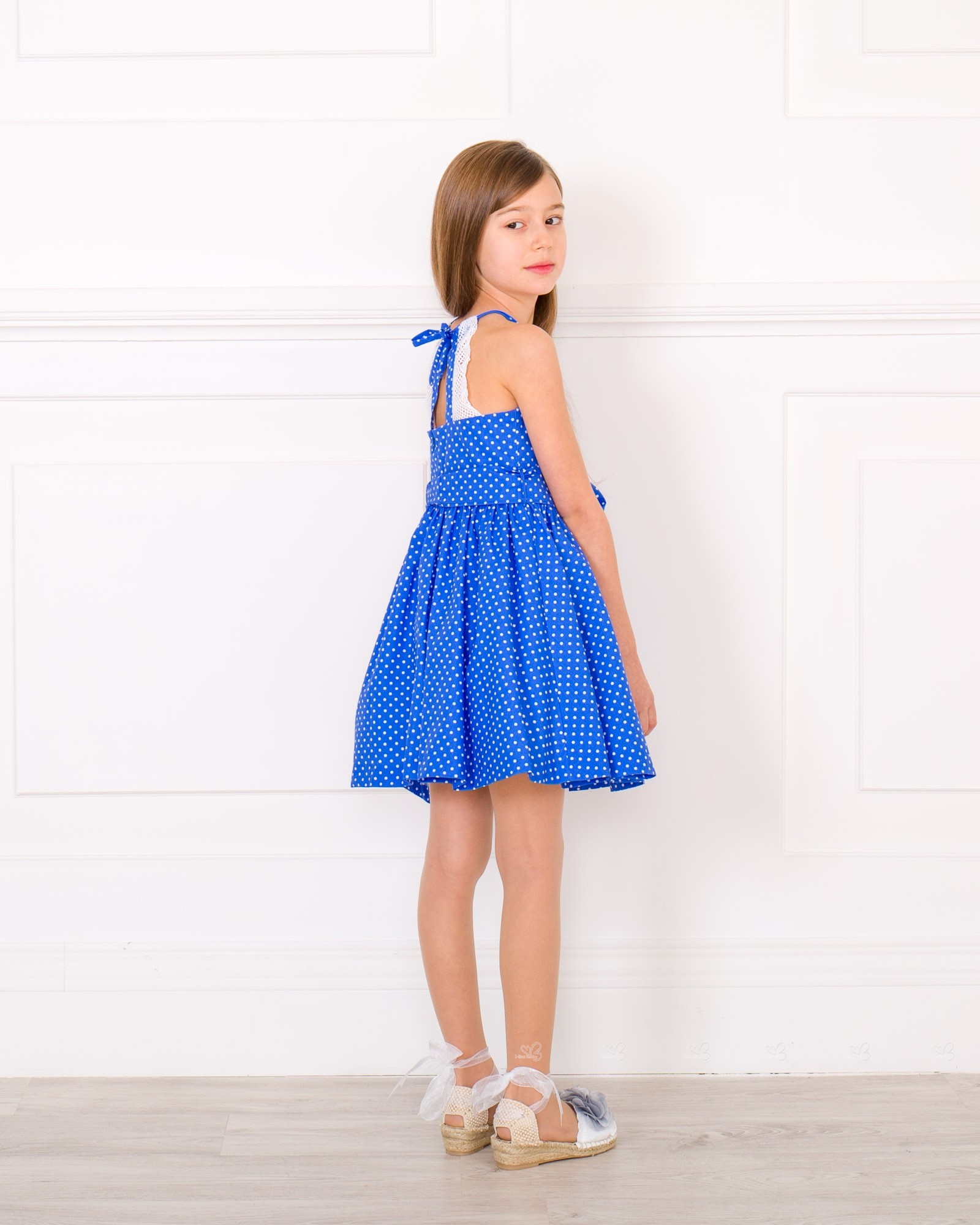 Foque Spring-Summer 2018 Collection. Girls blue polka dot flared dress with white crochet back.