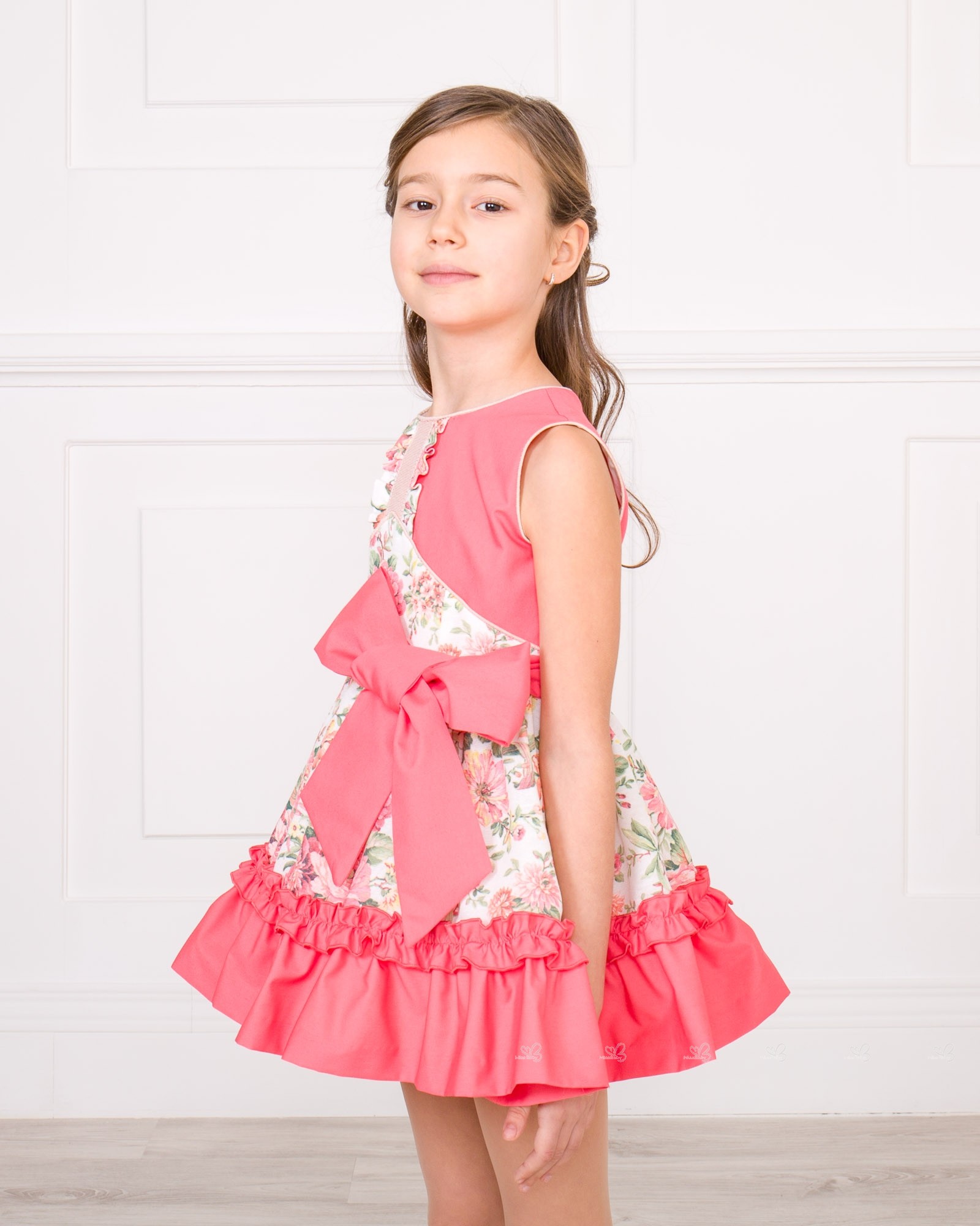 Girls Coral Pink Floral Print Dress with Maxi Bow Outfit