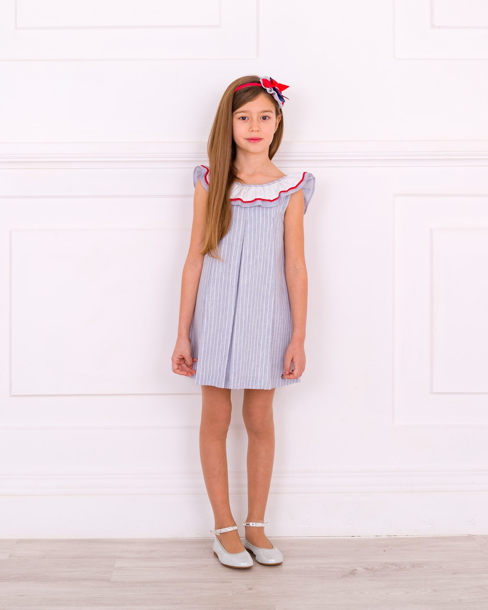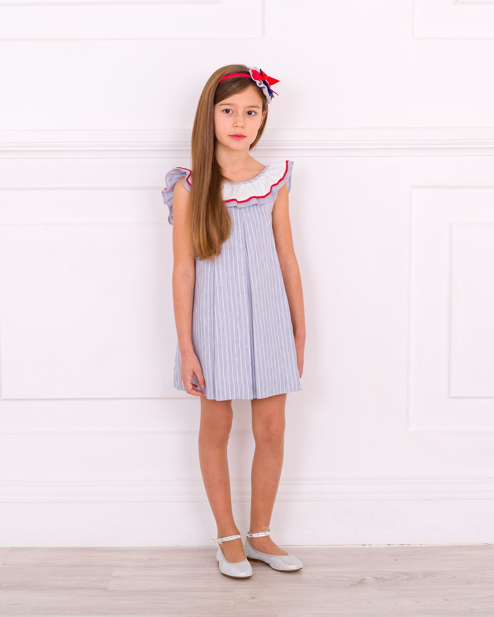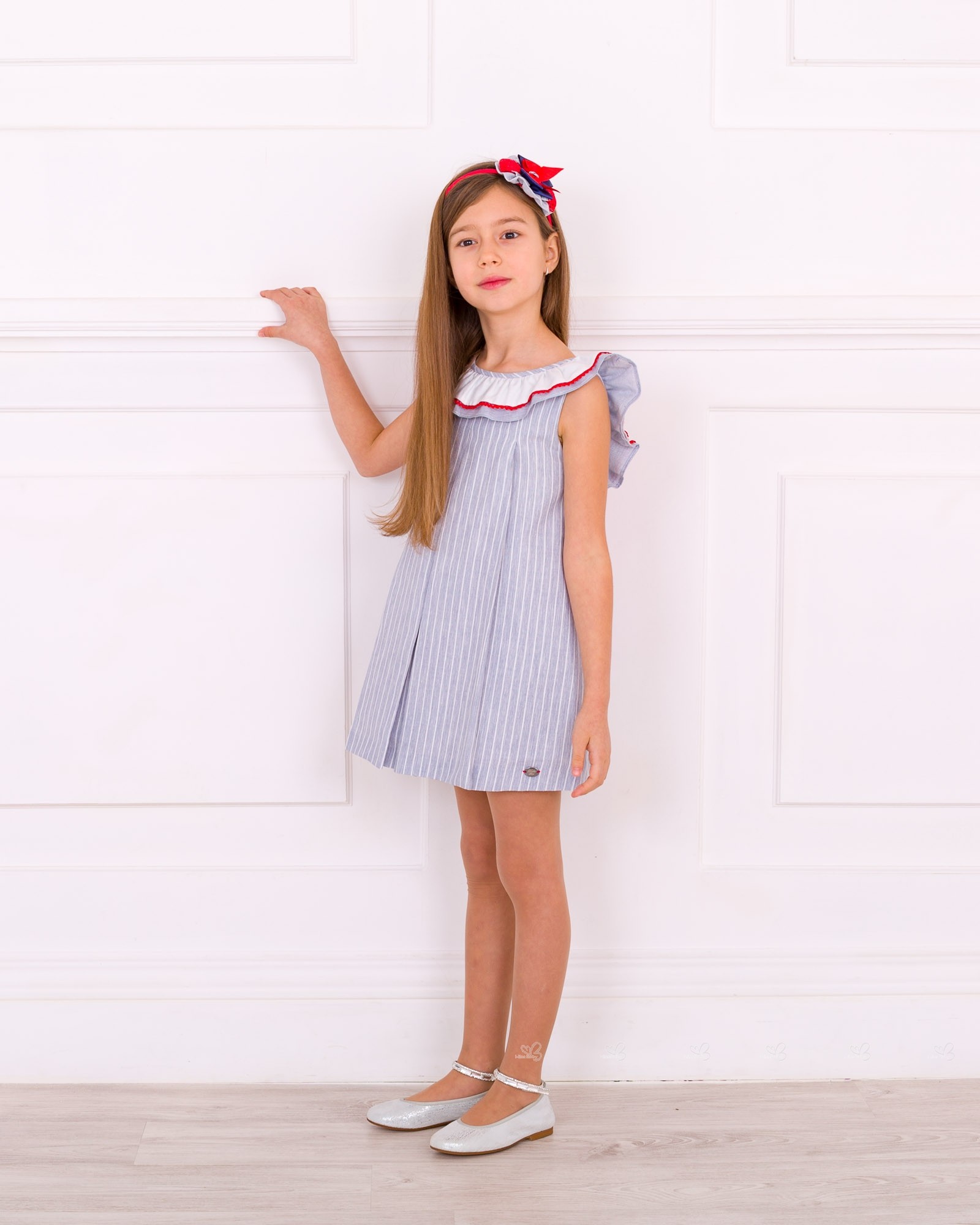 Dolce Petit Spring-Summer 2018 Collection. Girls denim blue and white striped dress with red polka dot back bow.