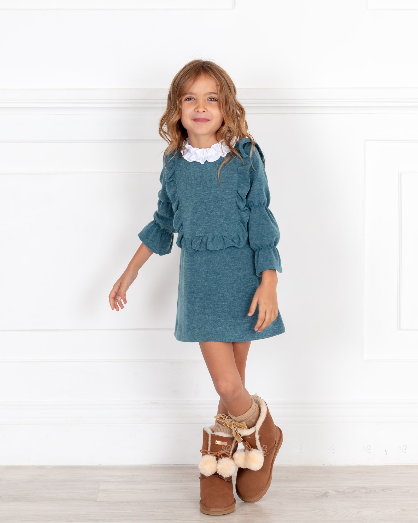 Ancar Autumn-Winter 2018/19 Collection. Girls green jersey shift dress with ruffle collar.