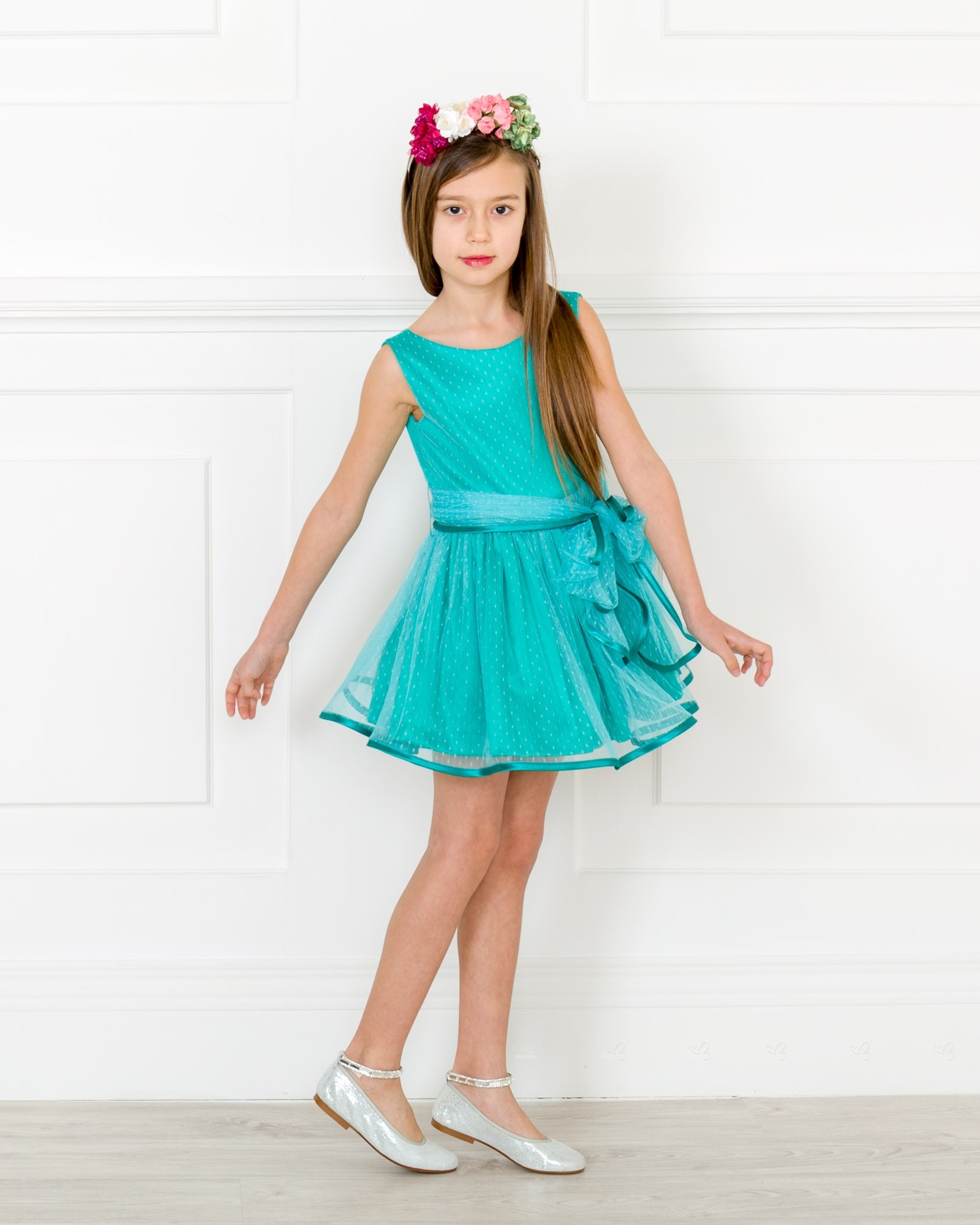 Nekenia Spring-Summer 2018 Tulipan Collection. Girls green satin and tulle flared dress.