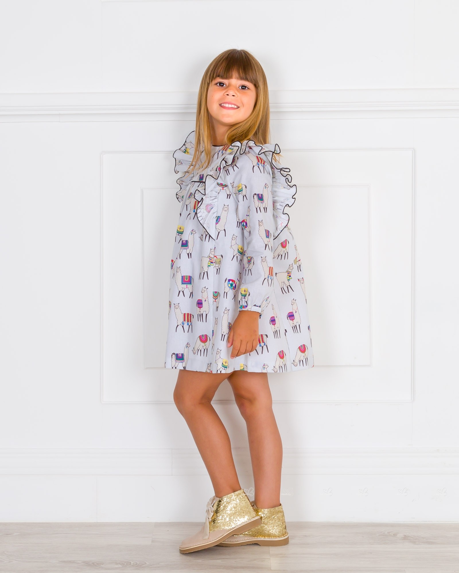 Girls Grey Llama Print Dress & Beige Glitter Boots Outfit
