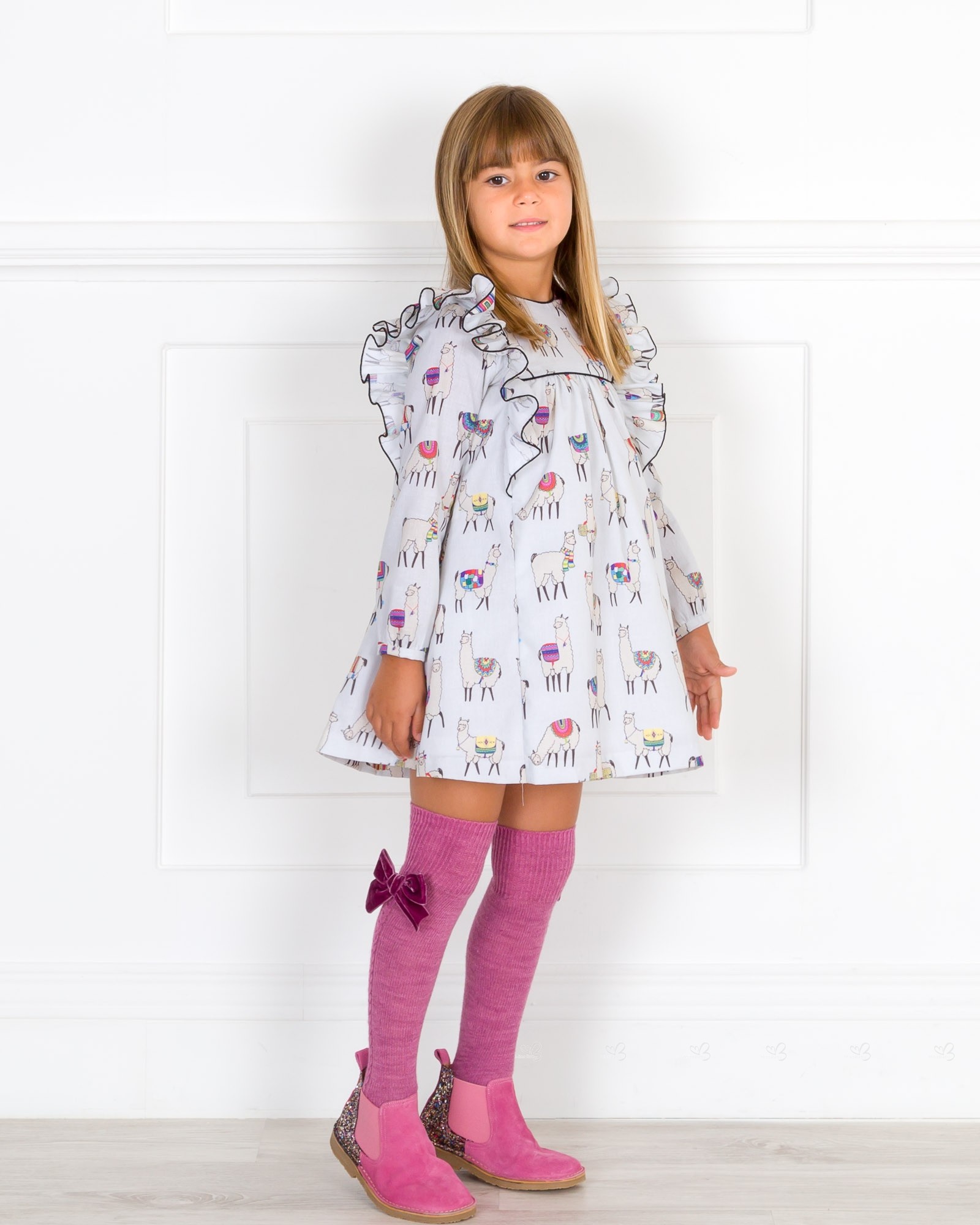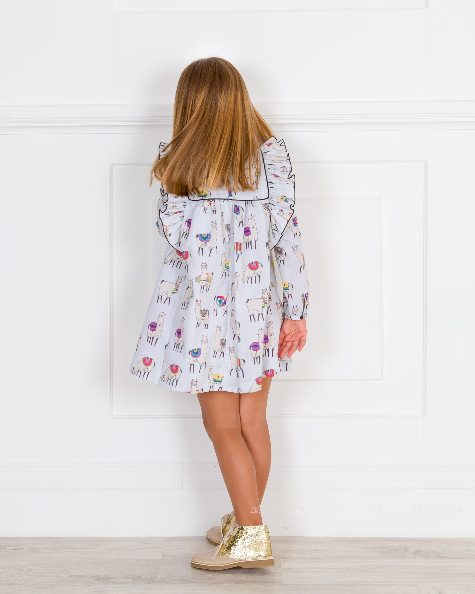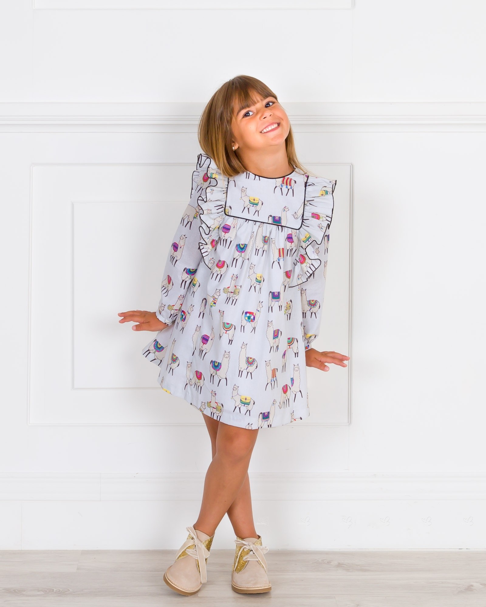 Mon Petit Bonbon Autumn-Winter 2018/19 Collection. Girls grey Llama print dress.