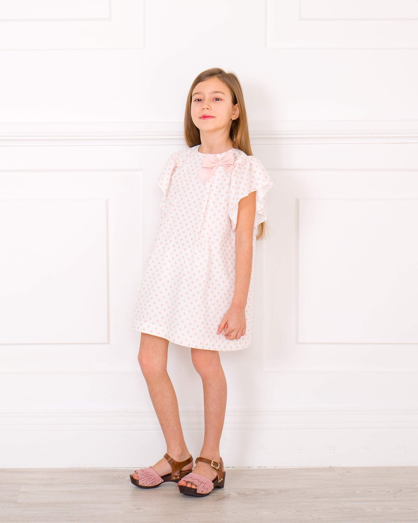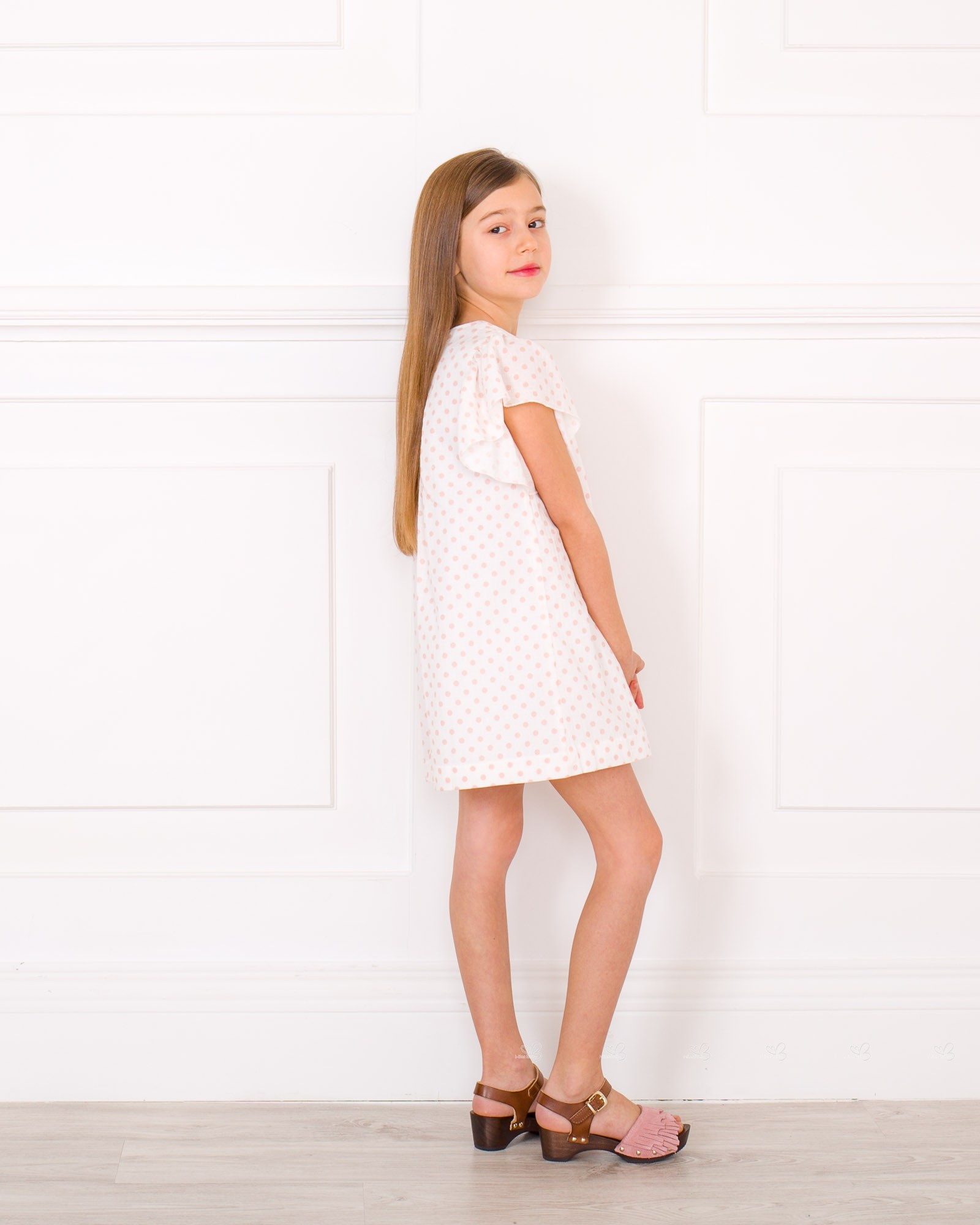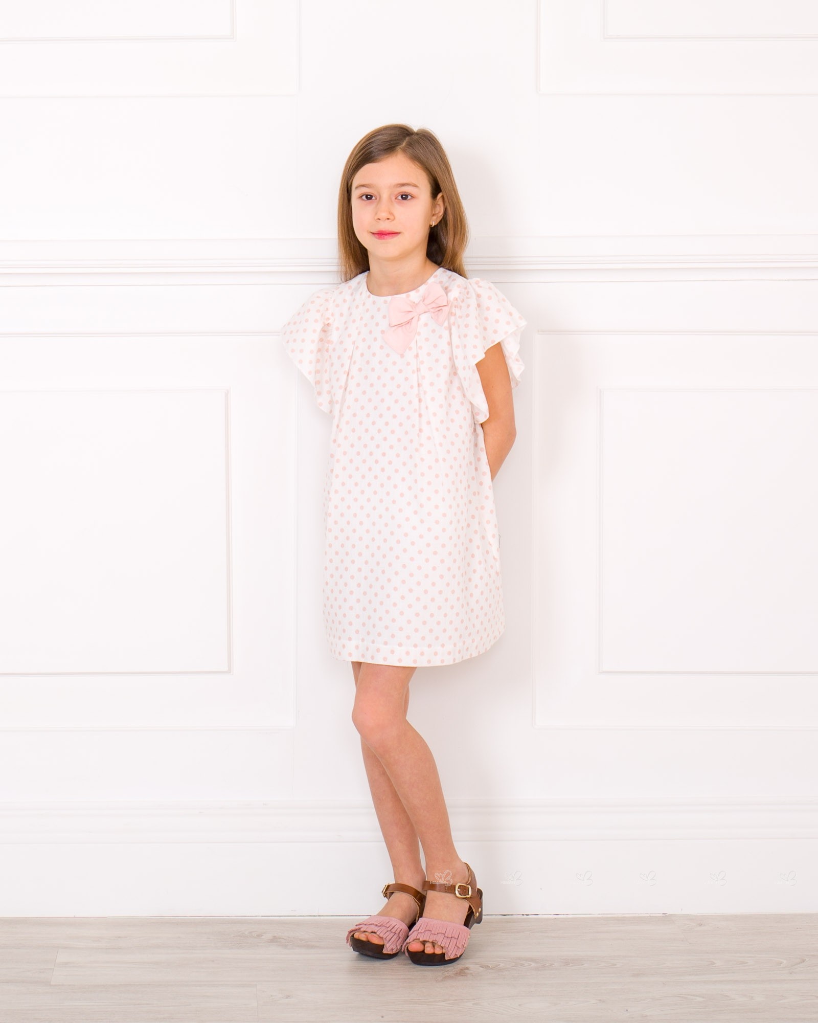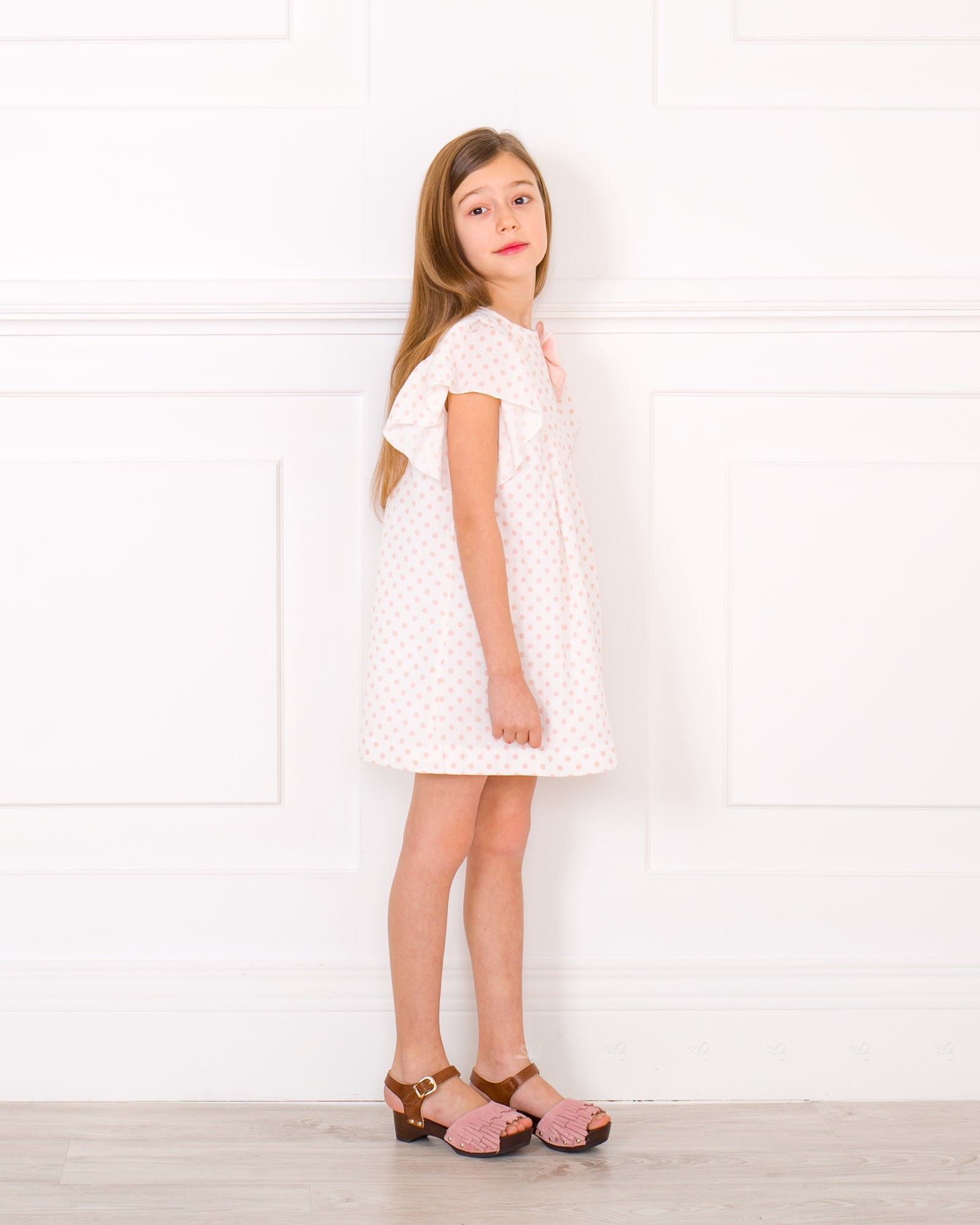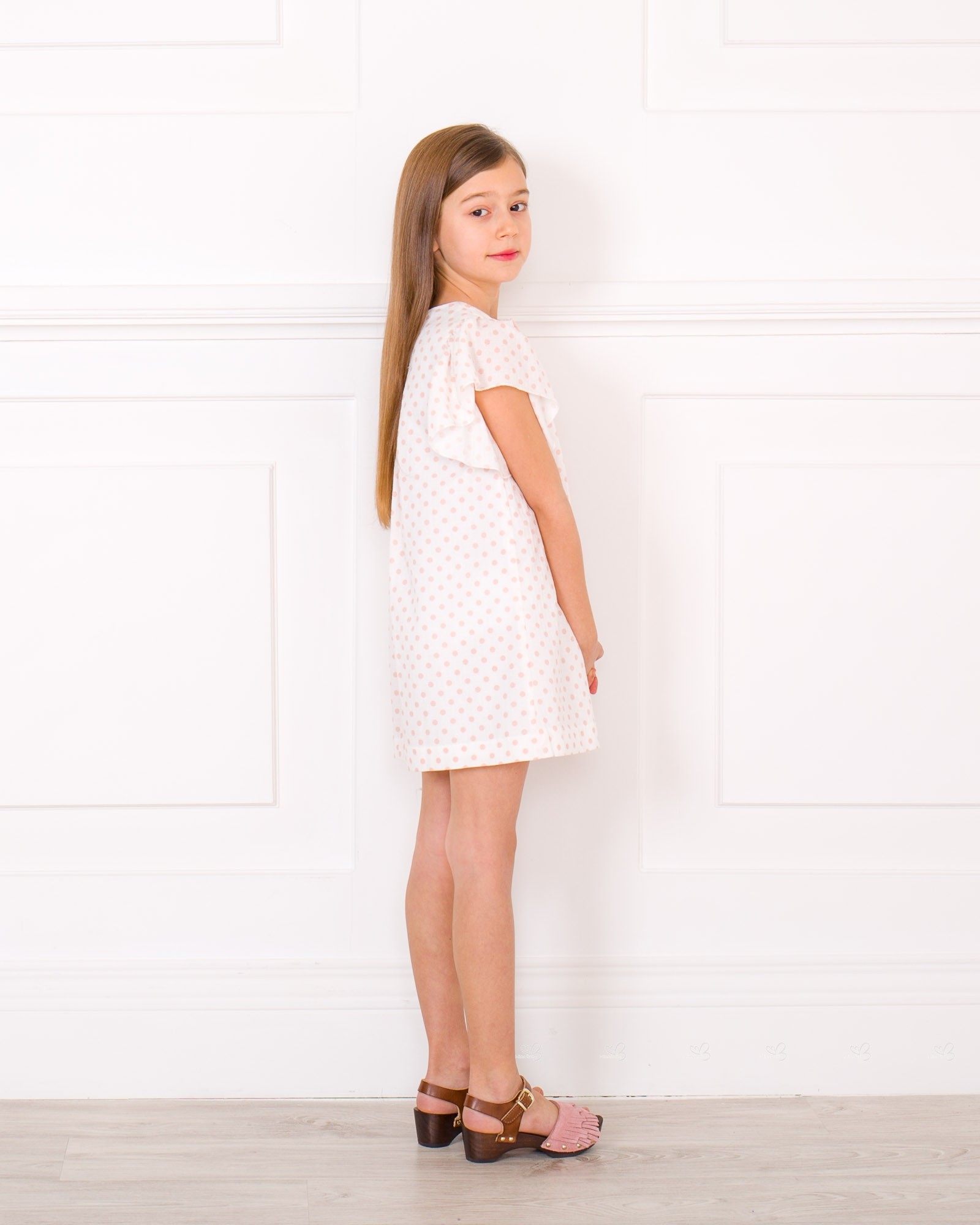 Manuela Montero Spring Summer 2018 Collectio, girls ivory and pale pink spotted viscose dress with gathered flounce sleeves.