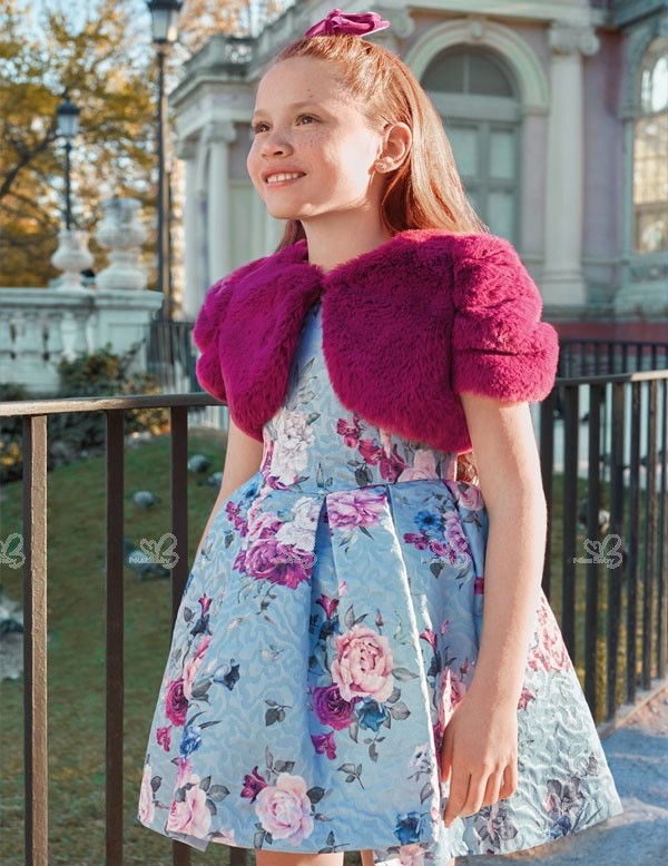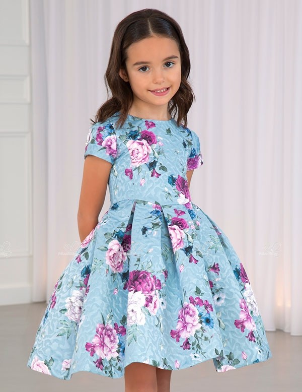 Abel & Lula Autumn-Winter 2019/20 Collection. Girls light blue floral print jacquard dress