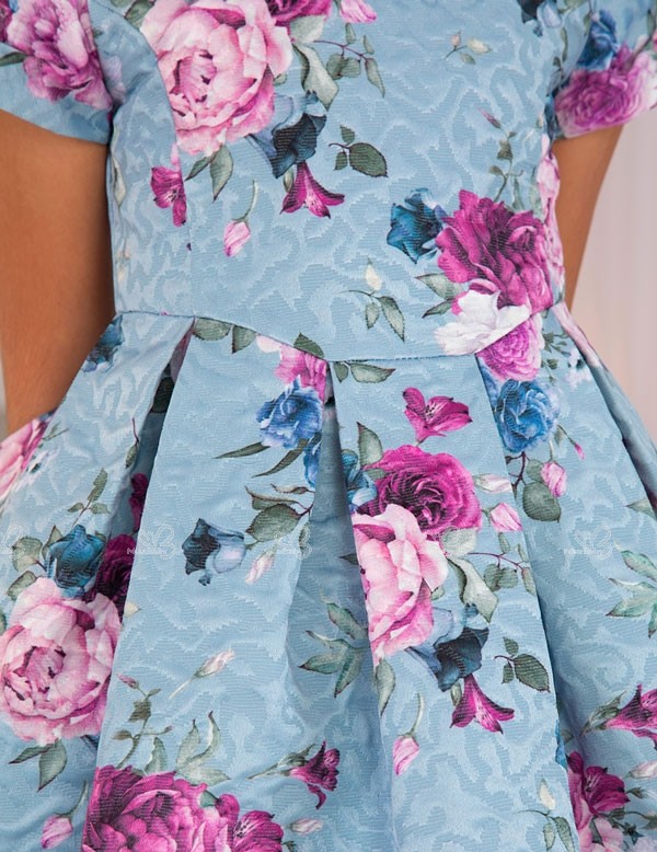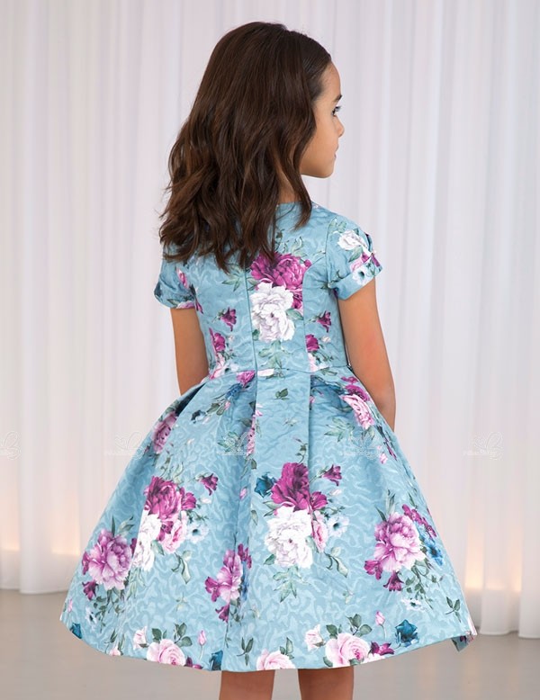 Girls Light Blue Floral Print Jacquard Dress