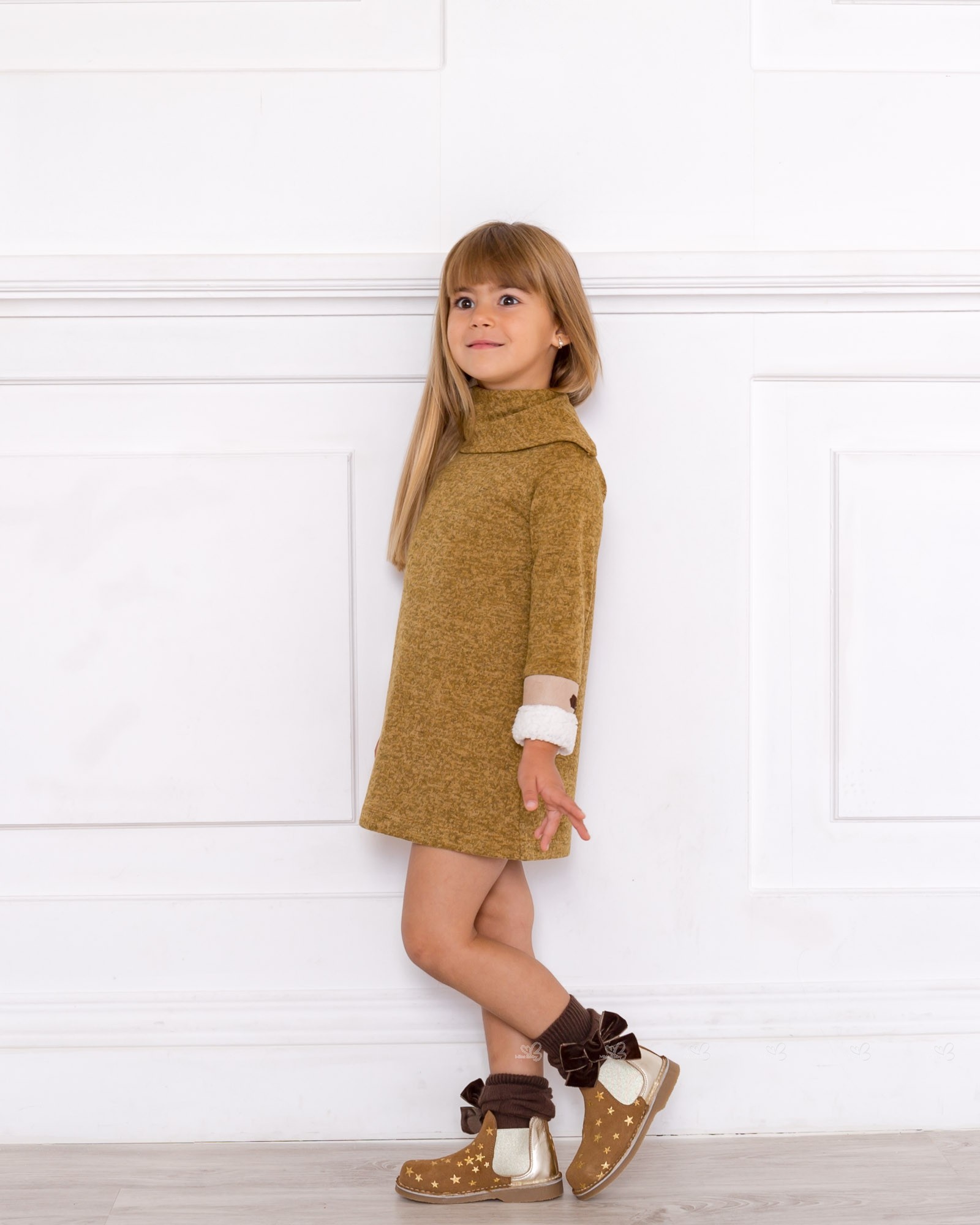 Girls Mustard & Brown Jersey Dress with Suedette Cuffs