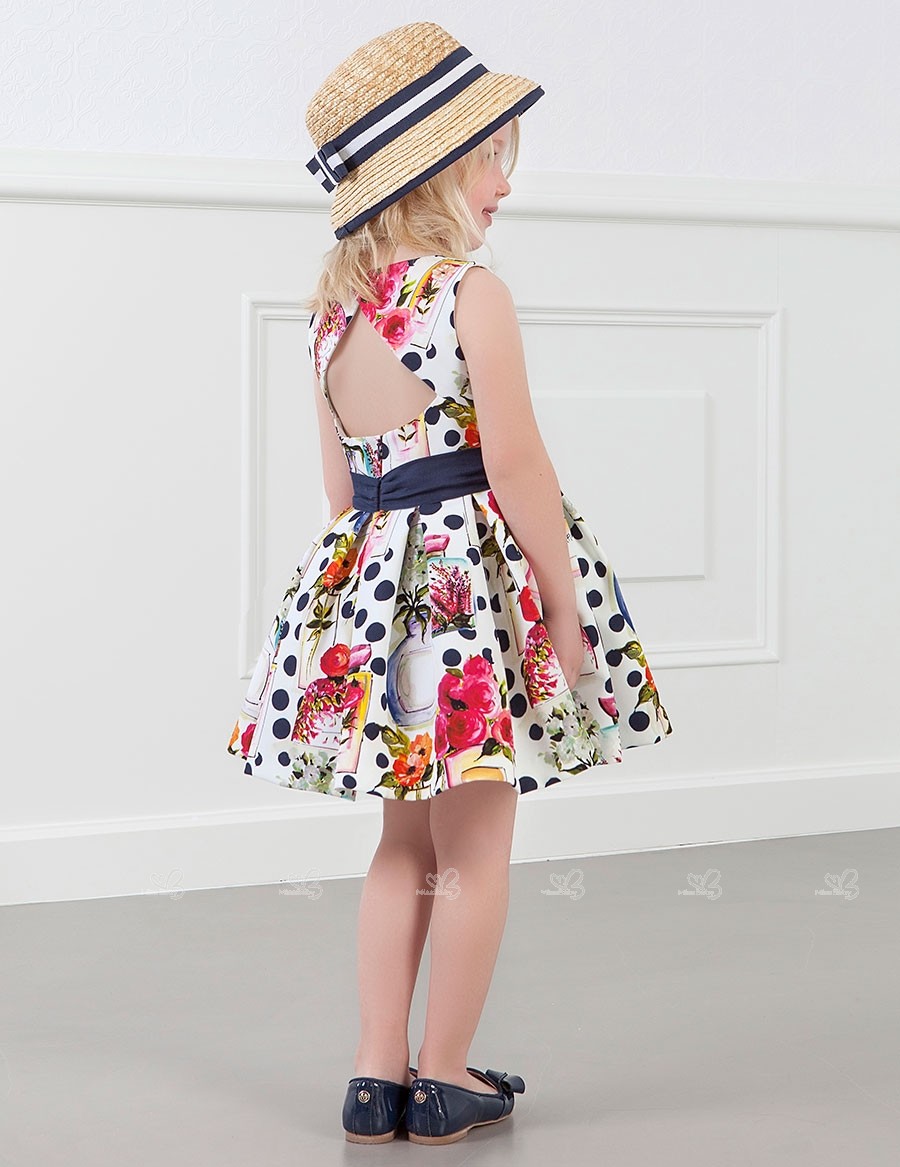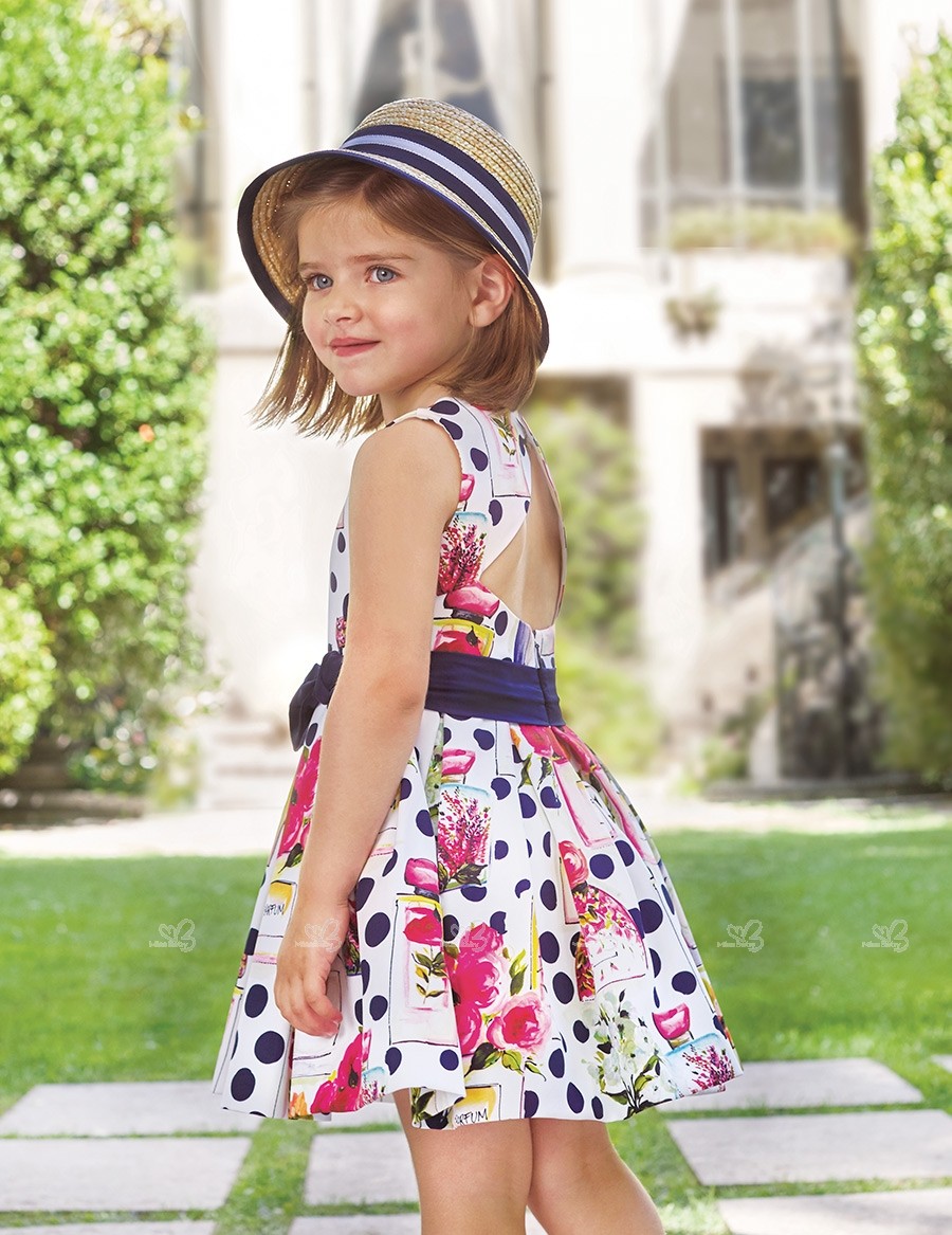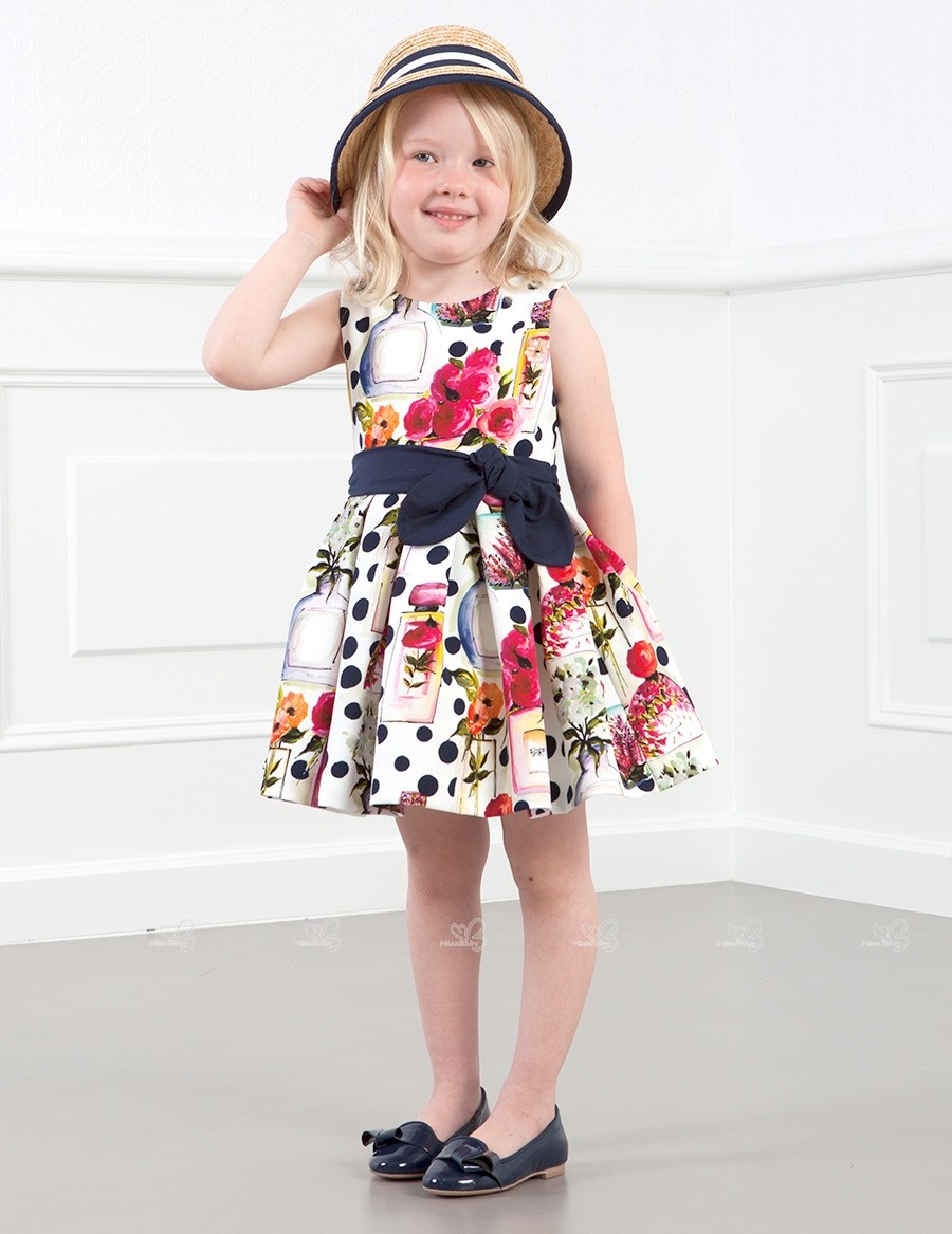 Abel & Lula Spring-Summer 2019 Collection. GIrls navy blue and red perfume pleated dress with sash.