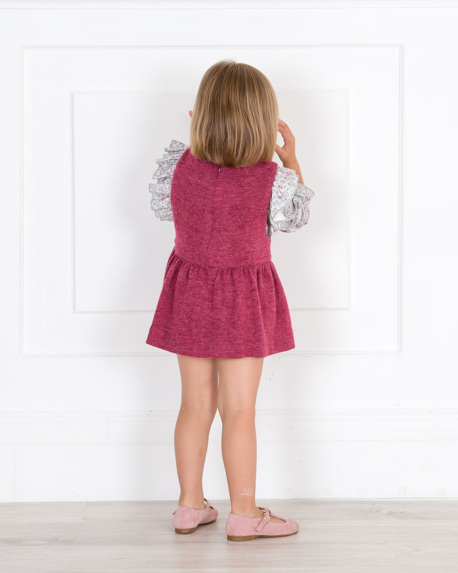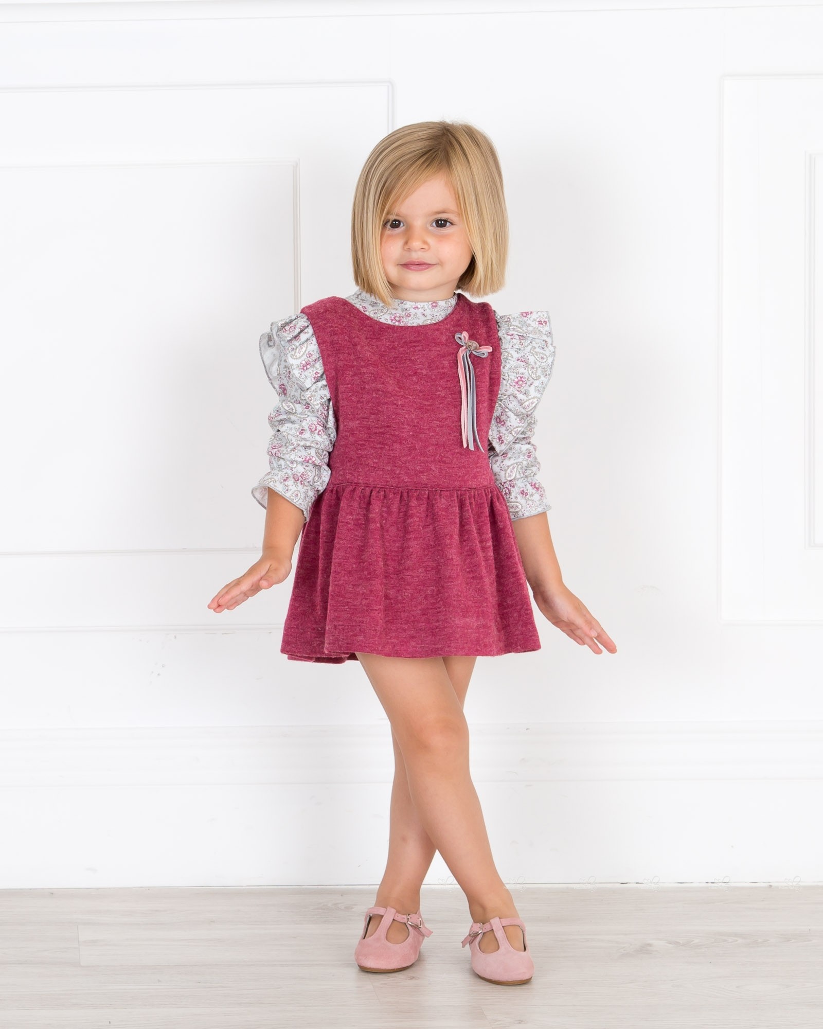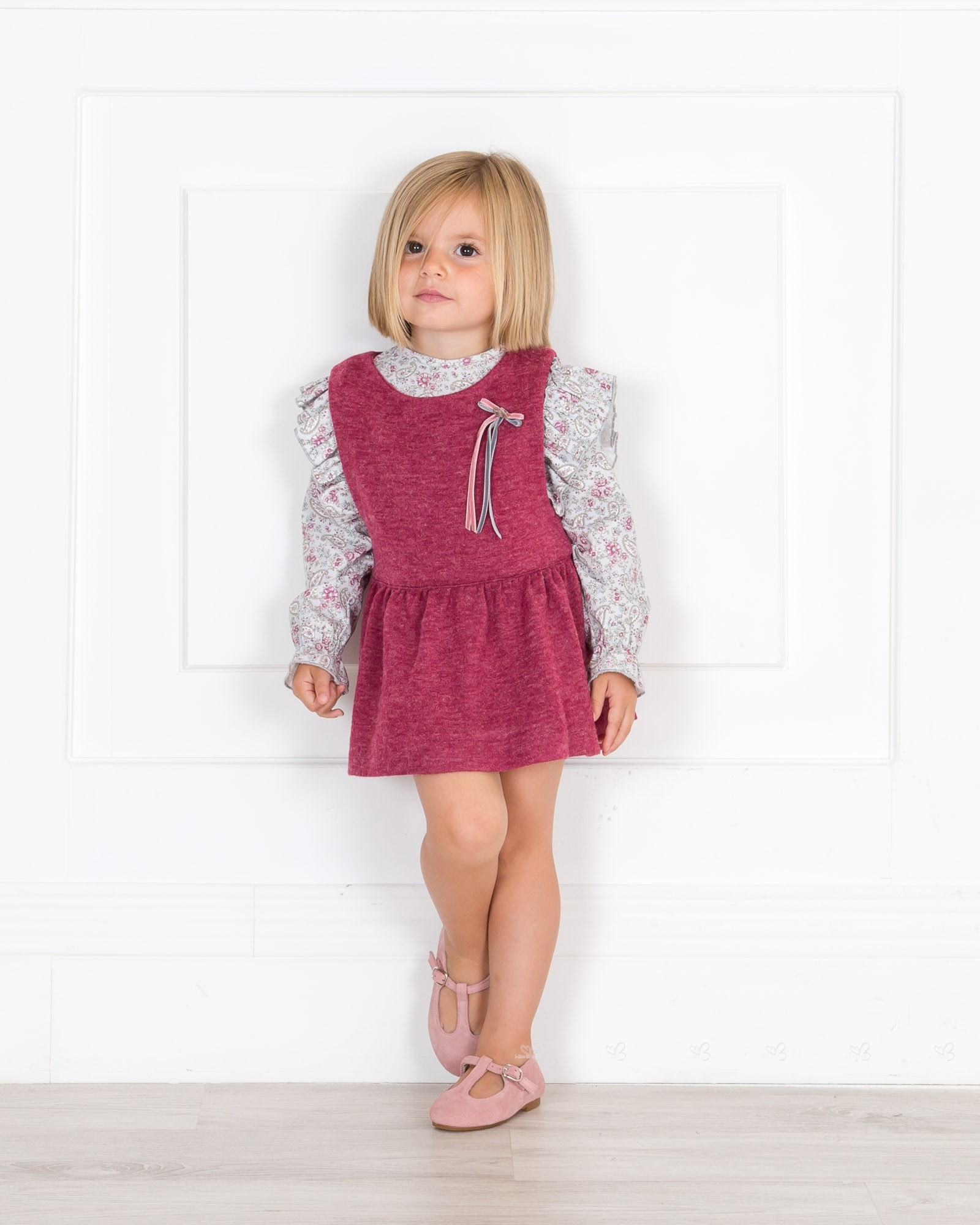 Baby Yiro Autumn-Winter 2018/19 Collection. Baby girls paisley print blouse and burgundy pinafore dress set.