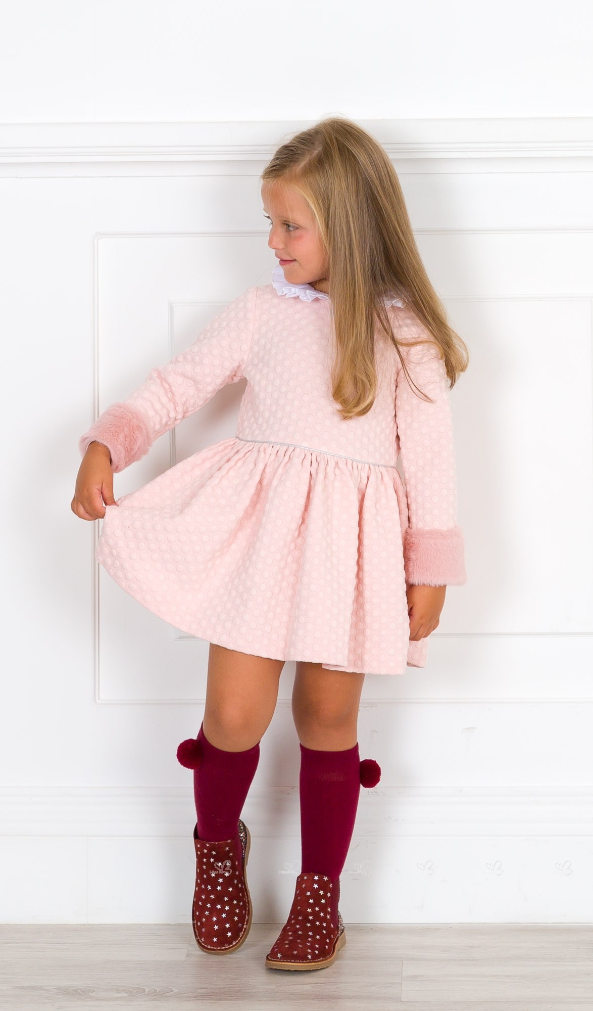 Mon Petit Bonbon Autumn-Winter 2018/19 Collection. Girls pale pink polka dress with synthetic fur cuffs.