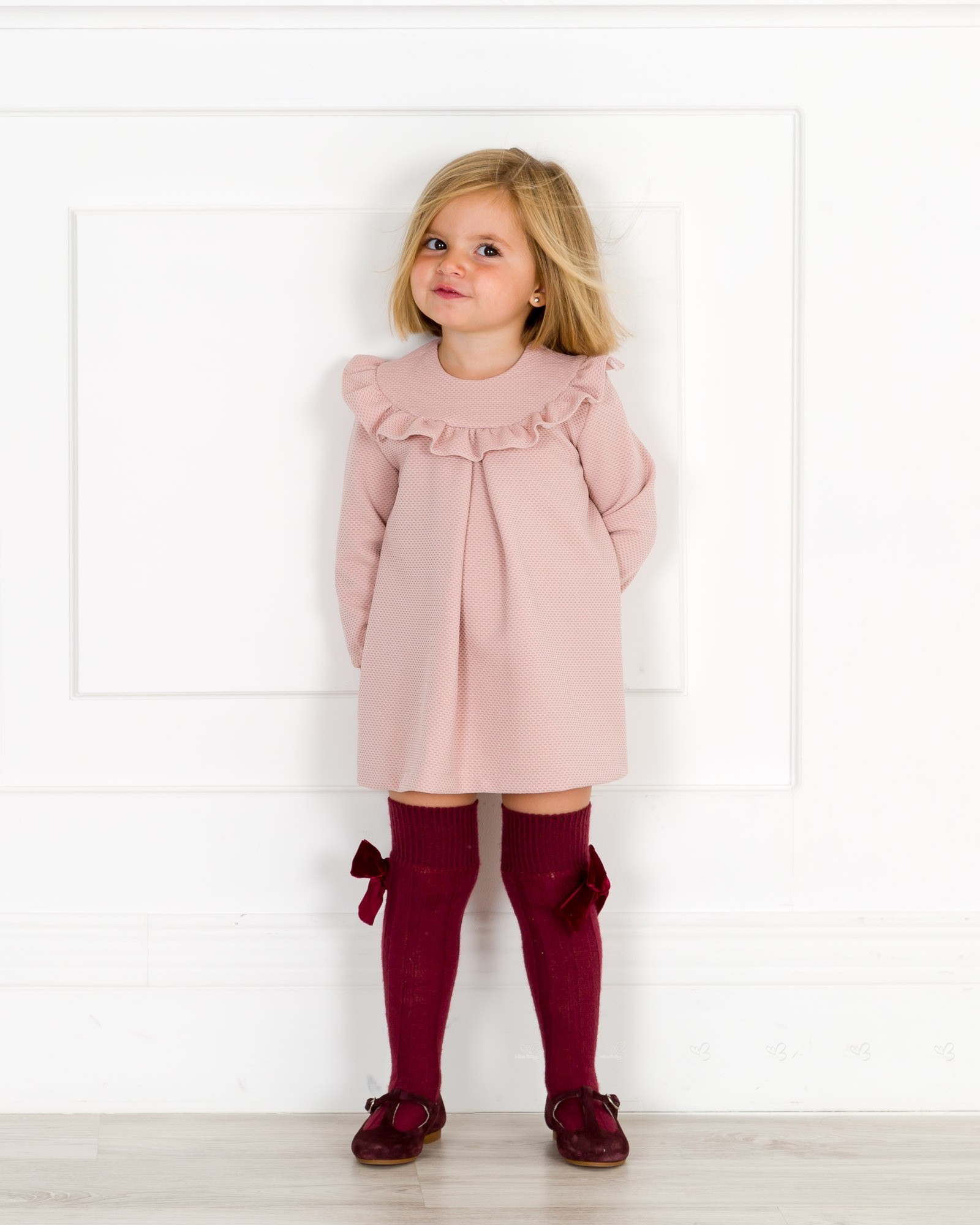 Nekenia Autumn-Winter 2018/19 Collection. Girls pale pink stretch jersey shift dress with ruffle yoke and bow.