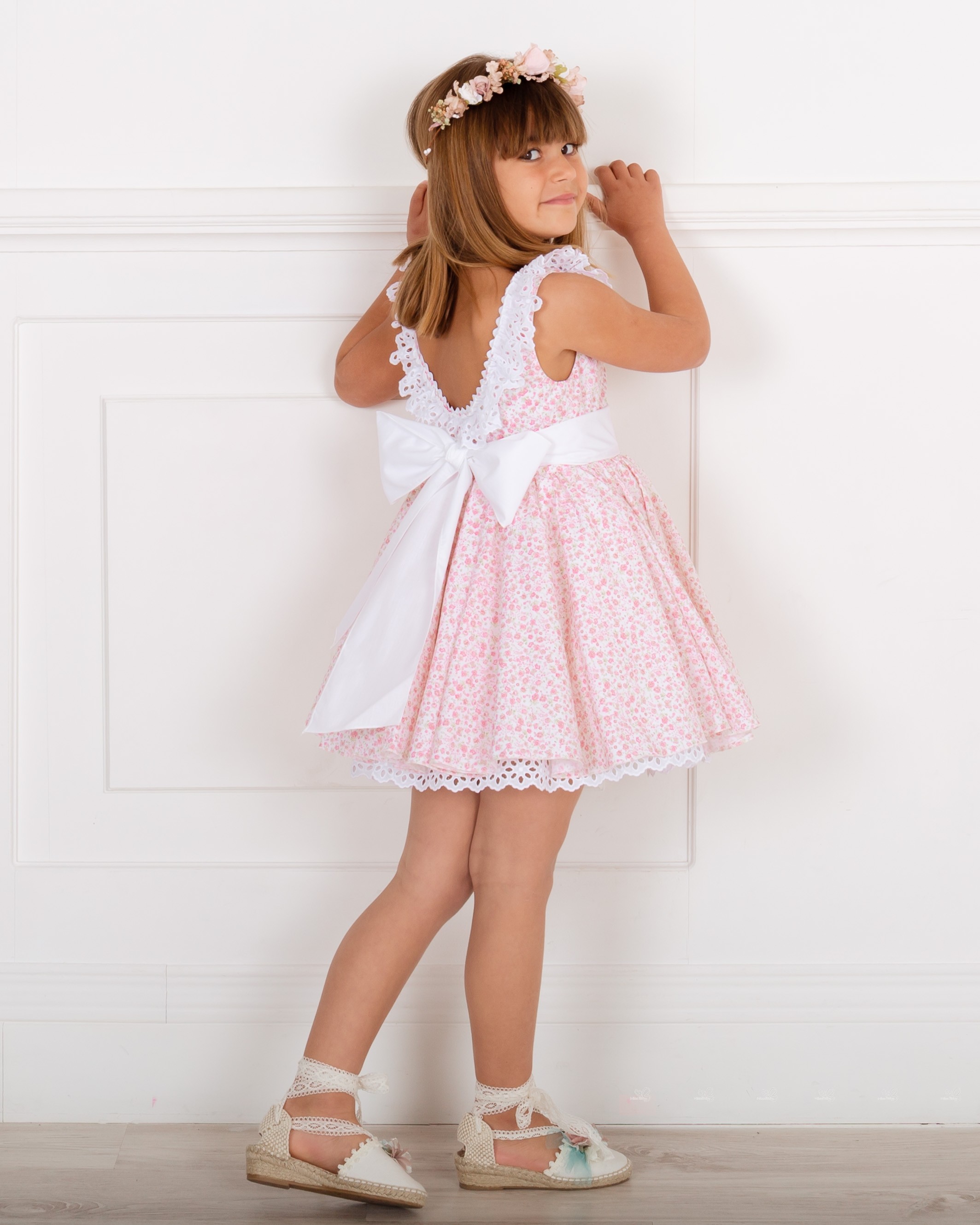 Badum Badero. Spring Summer 2019 Algodón Collection. Girls pink liberty dress & white maxi bow.