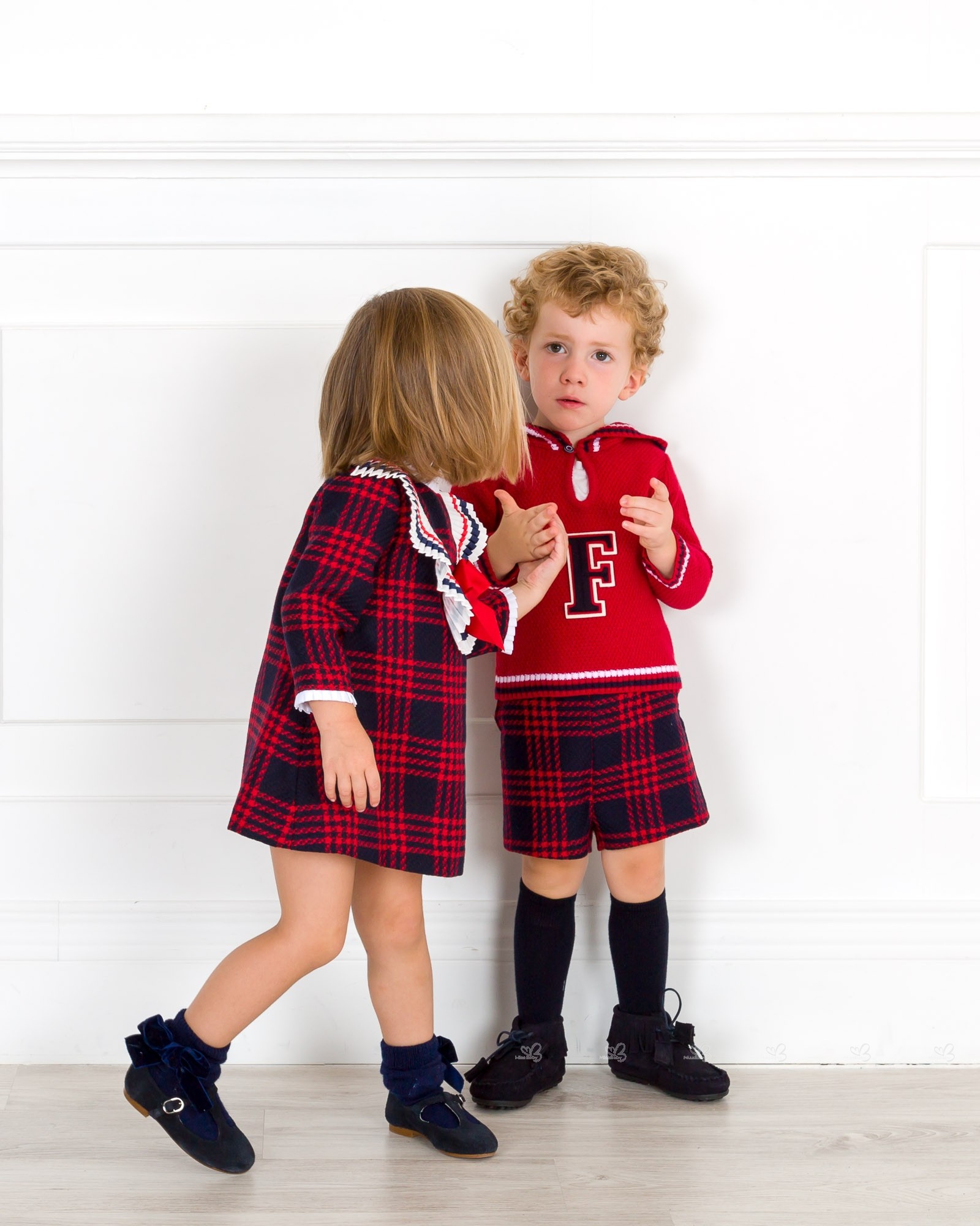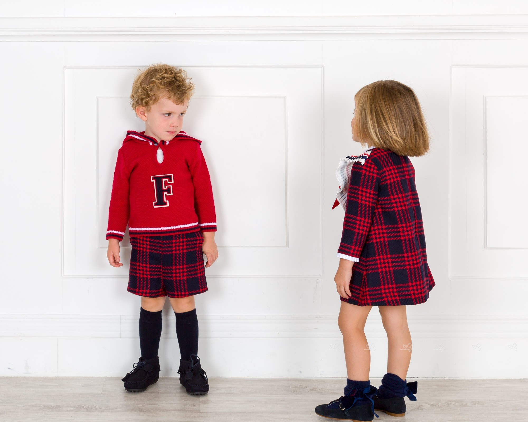 Foque Autumn-Winter 2018/19 Collection. Girls red and blue check pleated bow dress.