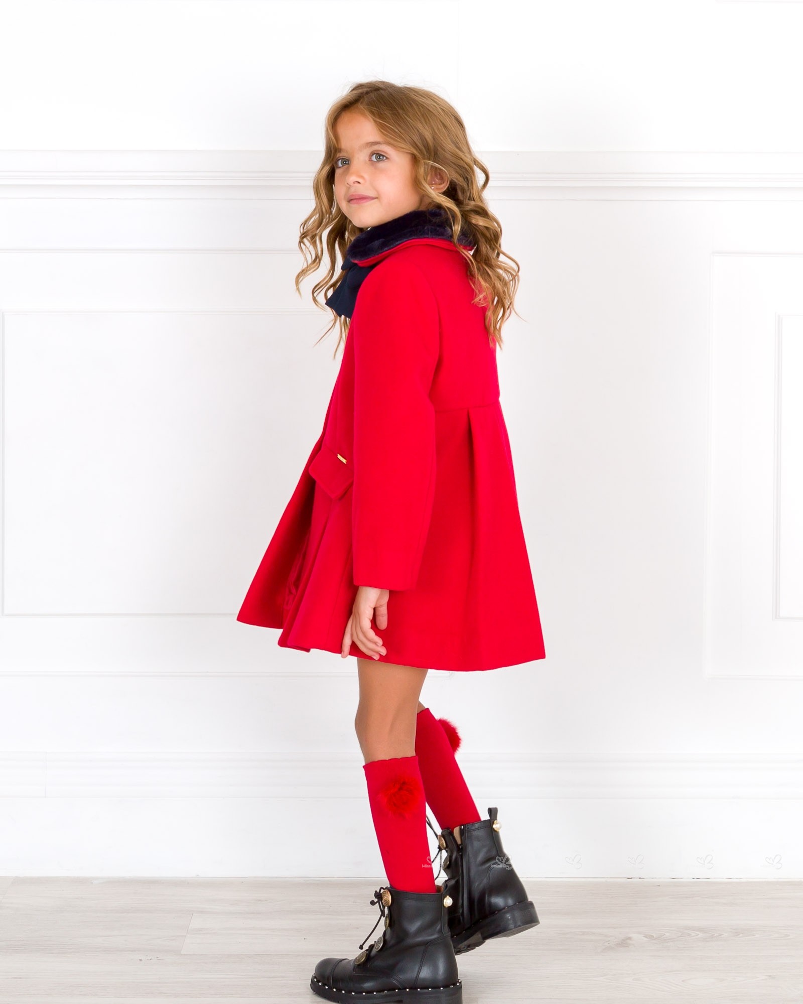 Dolce Petit Autumn-Winter 2018/19 Collection. Girls red coat with dark blue synthetic fur collar.