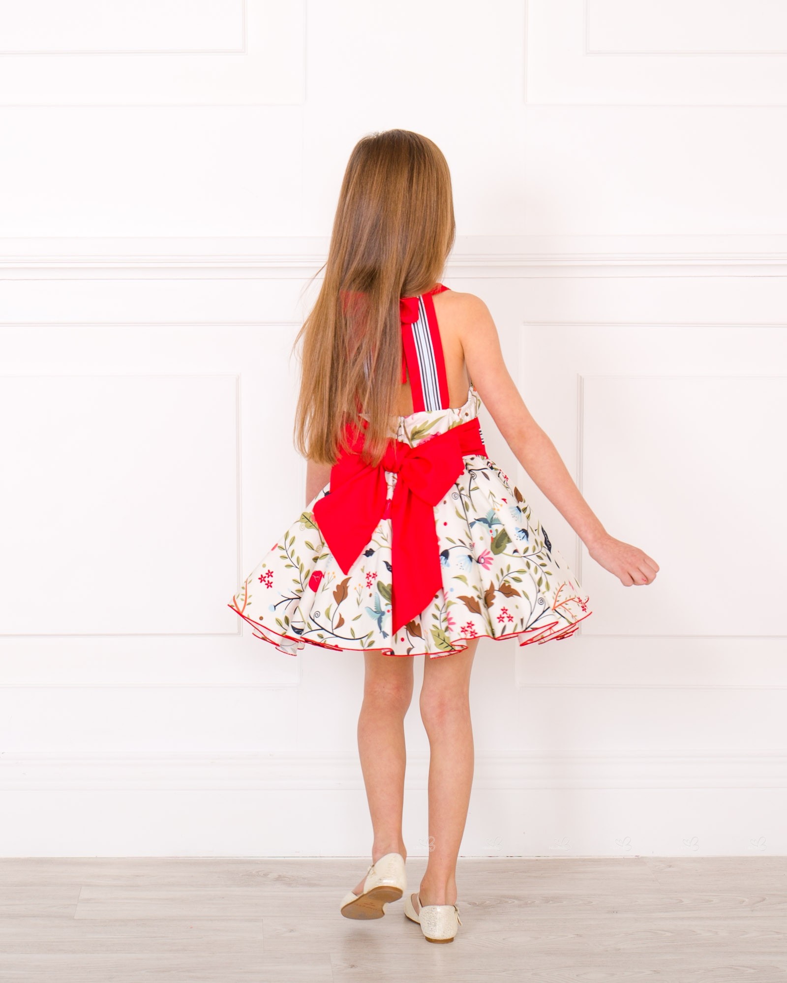 Badum Badero Spring-Summer 2018. Girls red floral and hummingbird print flared dress.
