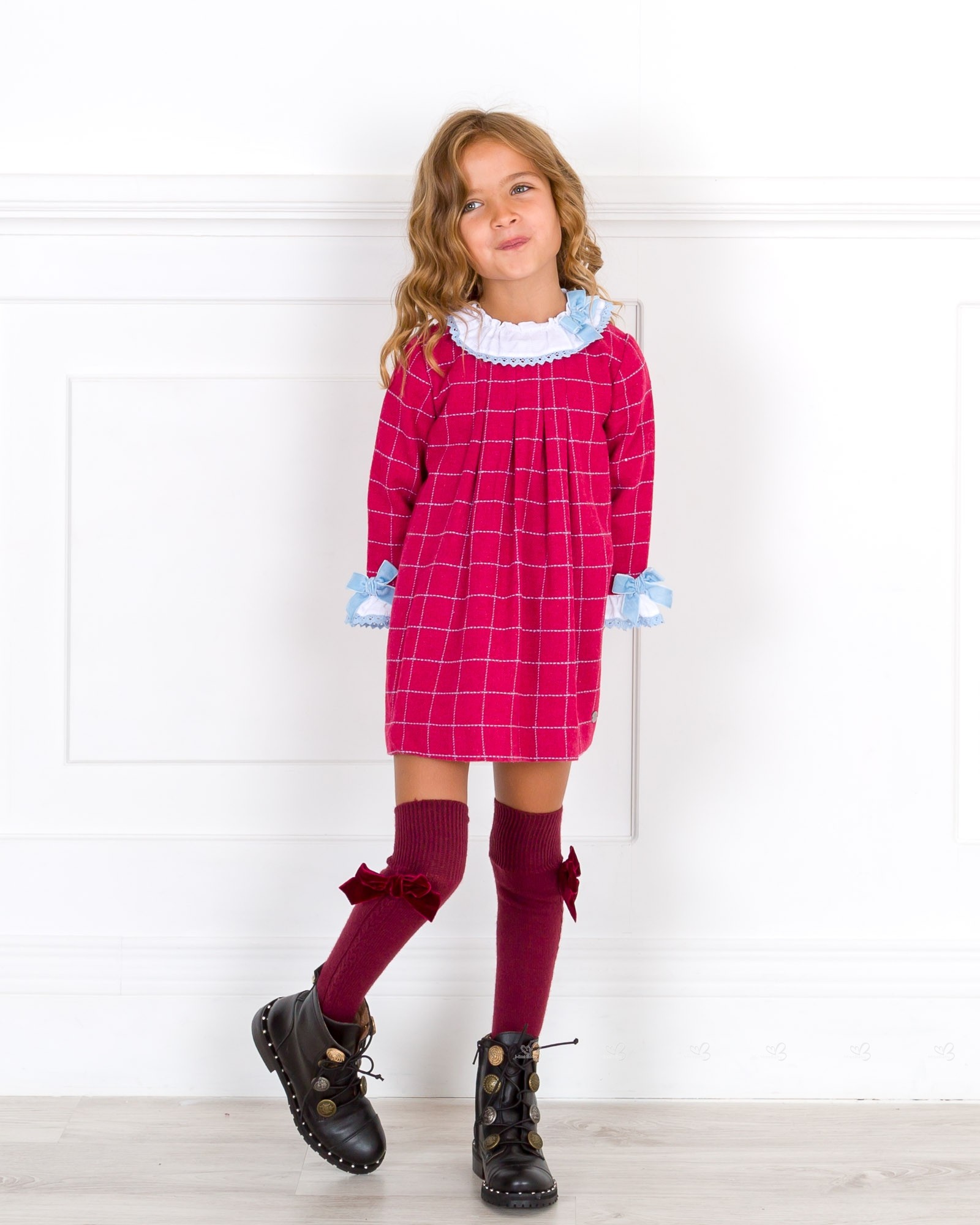 Dolce Petit Autumn-Winter 2018/19 Collection. Girls strawberry red and blue checked dress with white ruffle collar and cuffs.