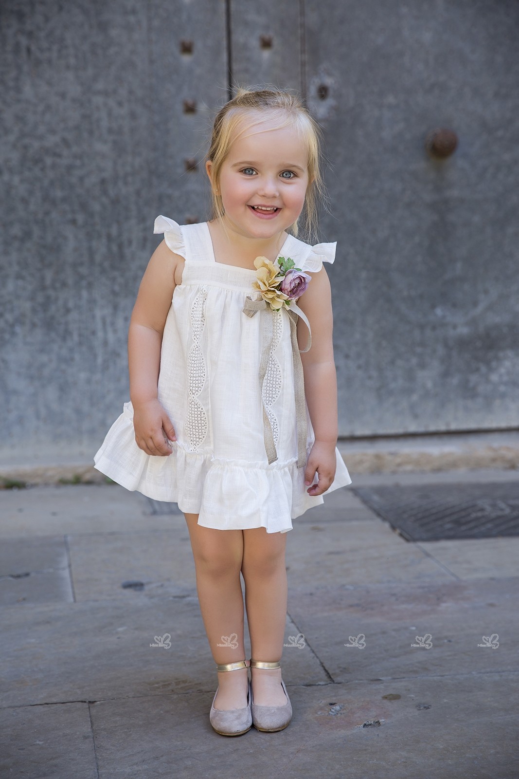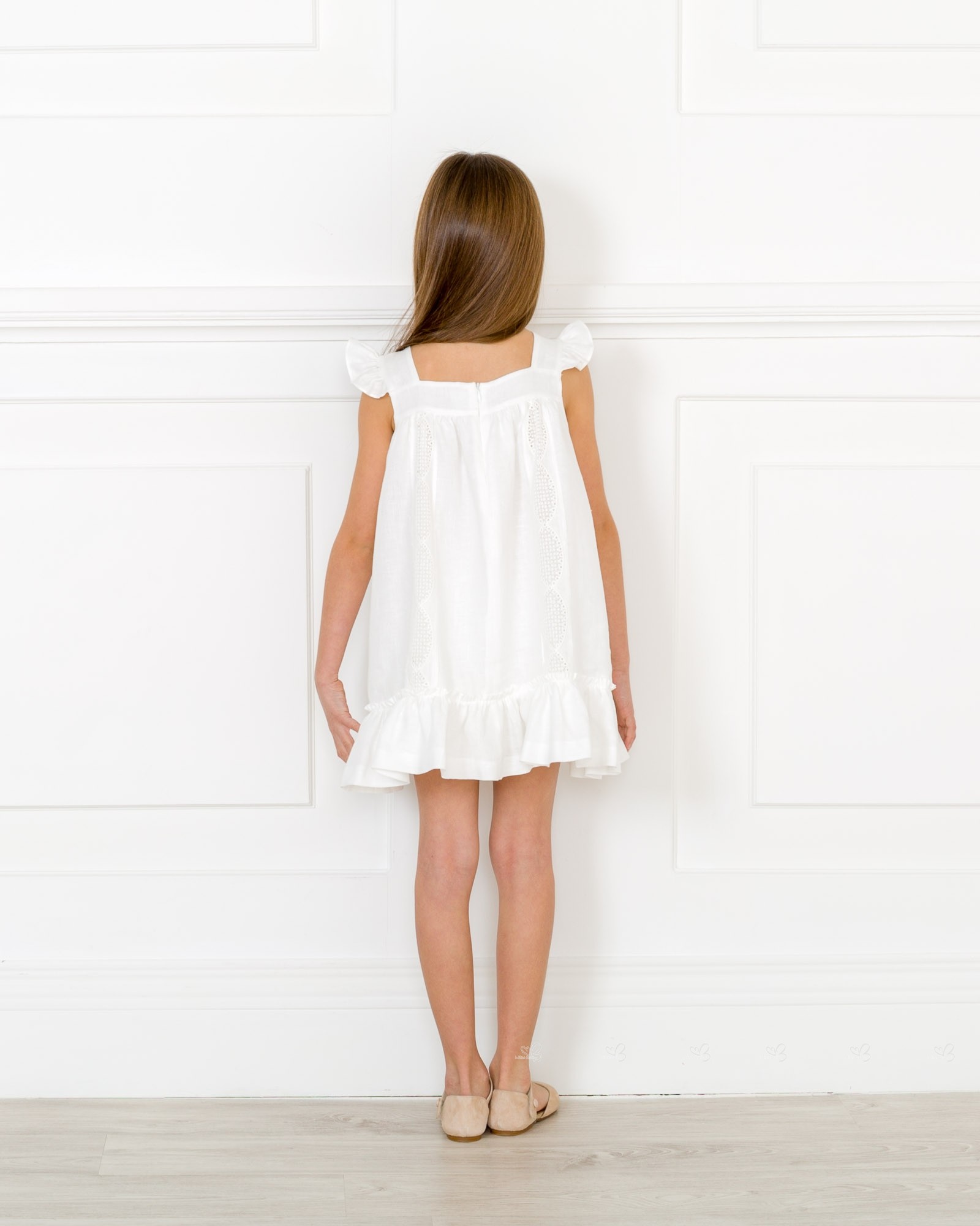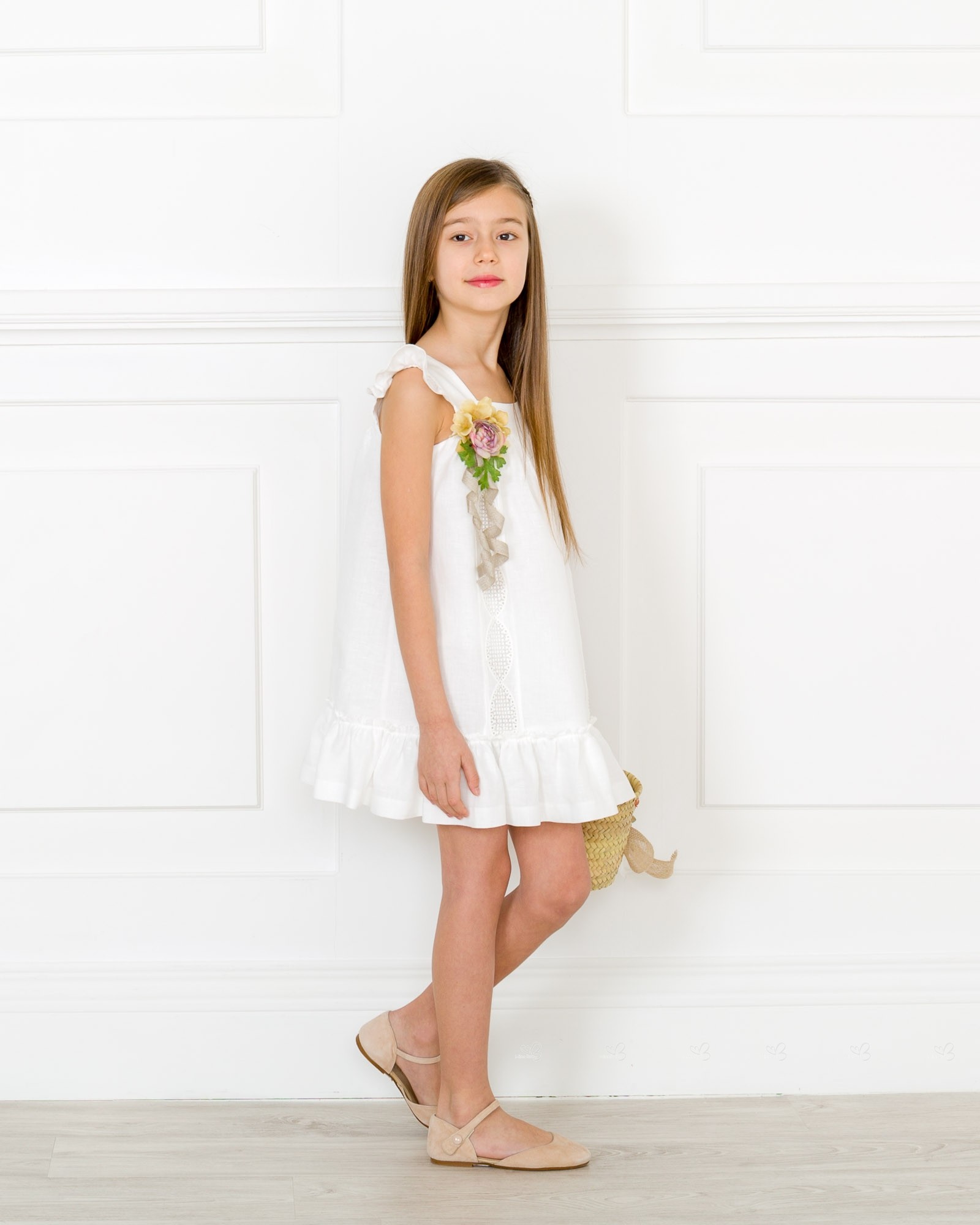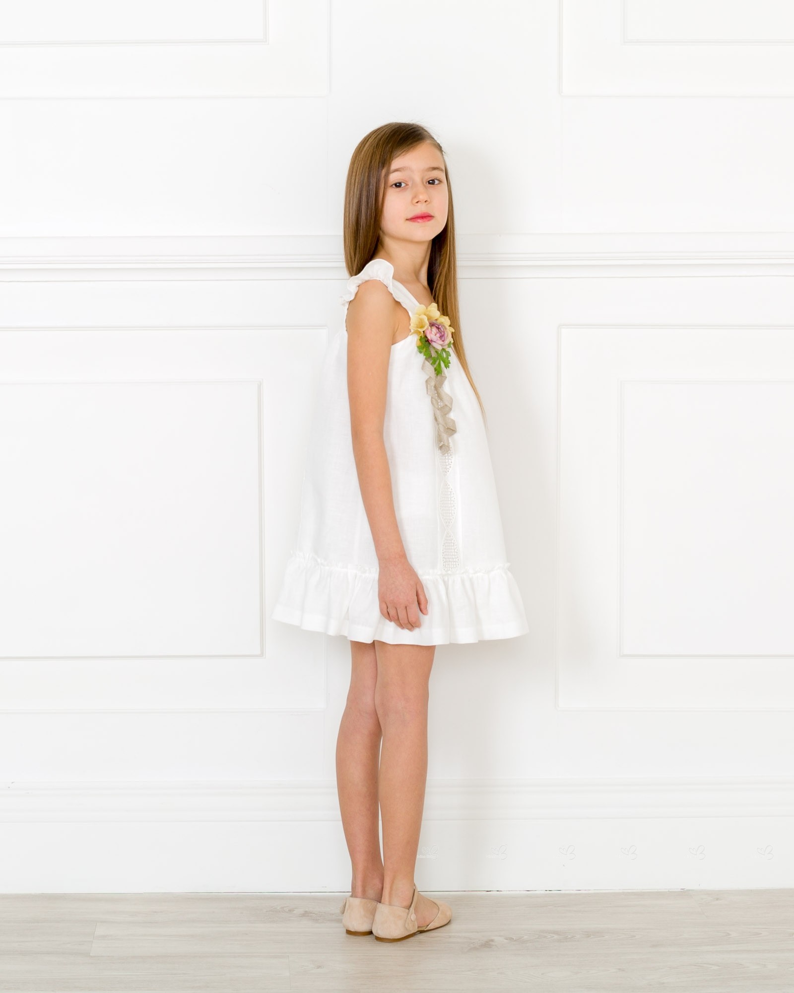 Girls White Linen Dress with Floral Brooch