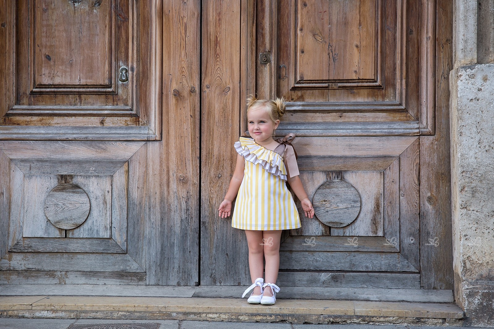 Rochy Spring-Summer 2018 Collection. Girls yellow and white ruffle off the shoulder dress.