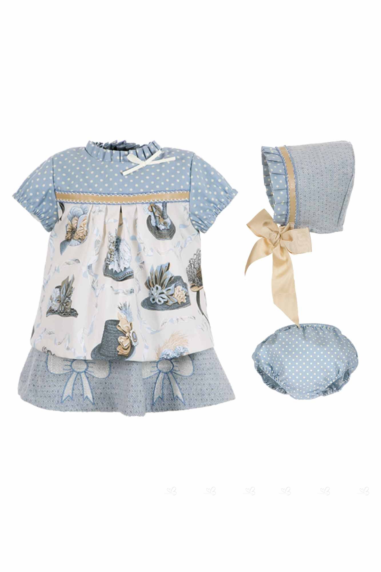 Braguita en celeste con lunares blancos y capota a juego para conseguir un look completo.