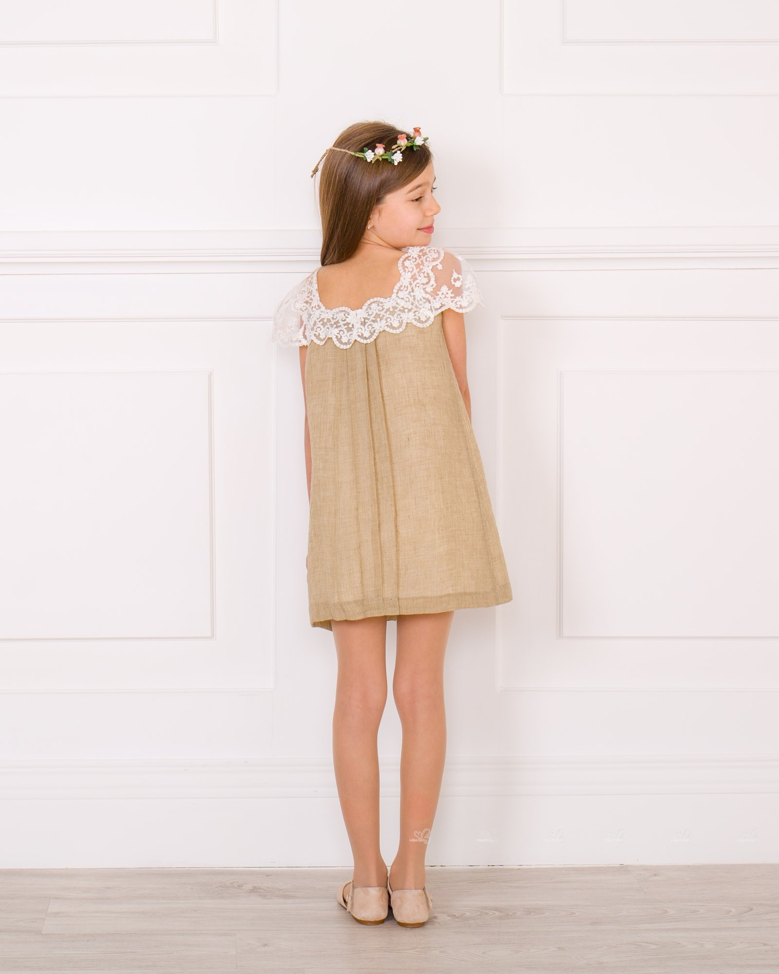 Girls Beige & Ivory Muslin Dress with Lace Neckline Outfit