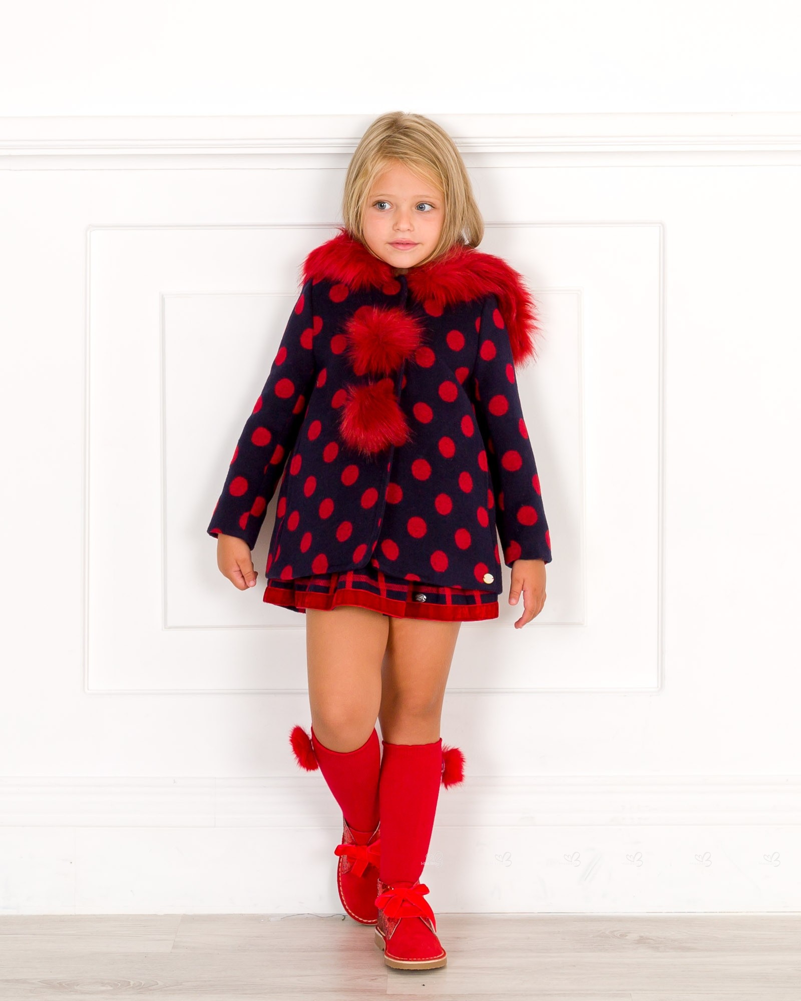 J.V. José Varón Colección Otoño-Invierno 2018/19. Abrigo niña en color marino con lunares guinda y capucha de suave pelo sintético al tono. Dos maxi pompones delante. Cierre con botones a presión y forro interior.