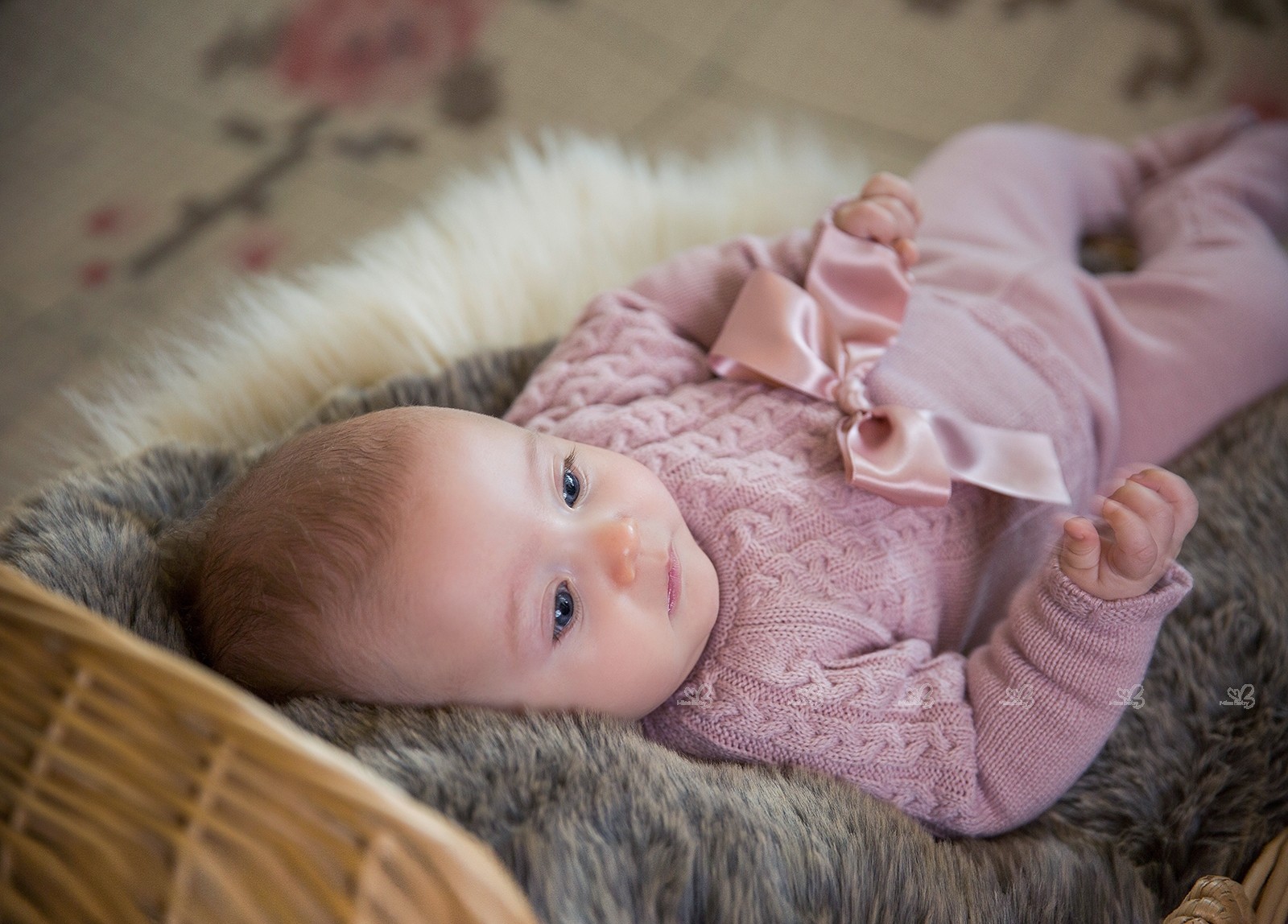 Rochy Colección Otoño-Invierno 2018/19. Conjunto bebé jersey y polaina punto ochitos en color rosa palo Lazada en pecho al tono y cierre con botones en espalda.