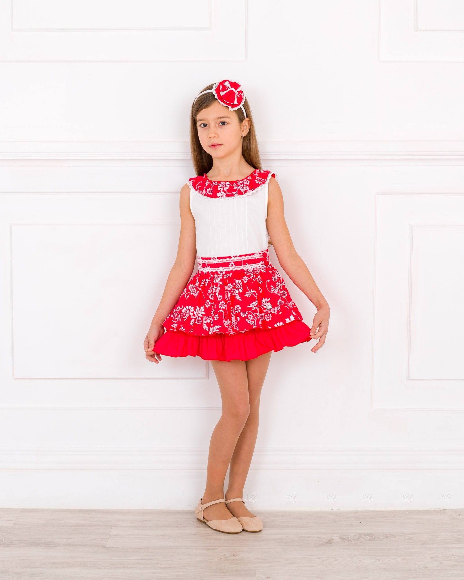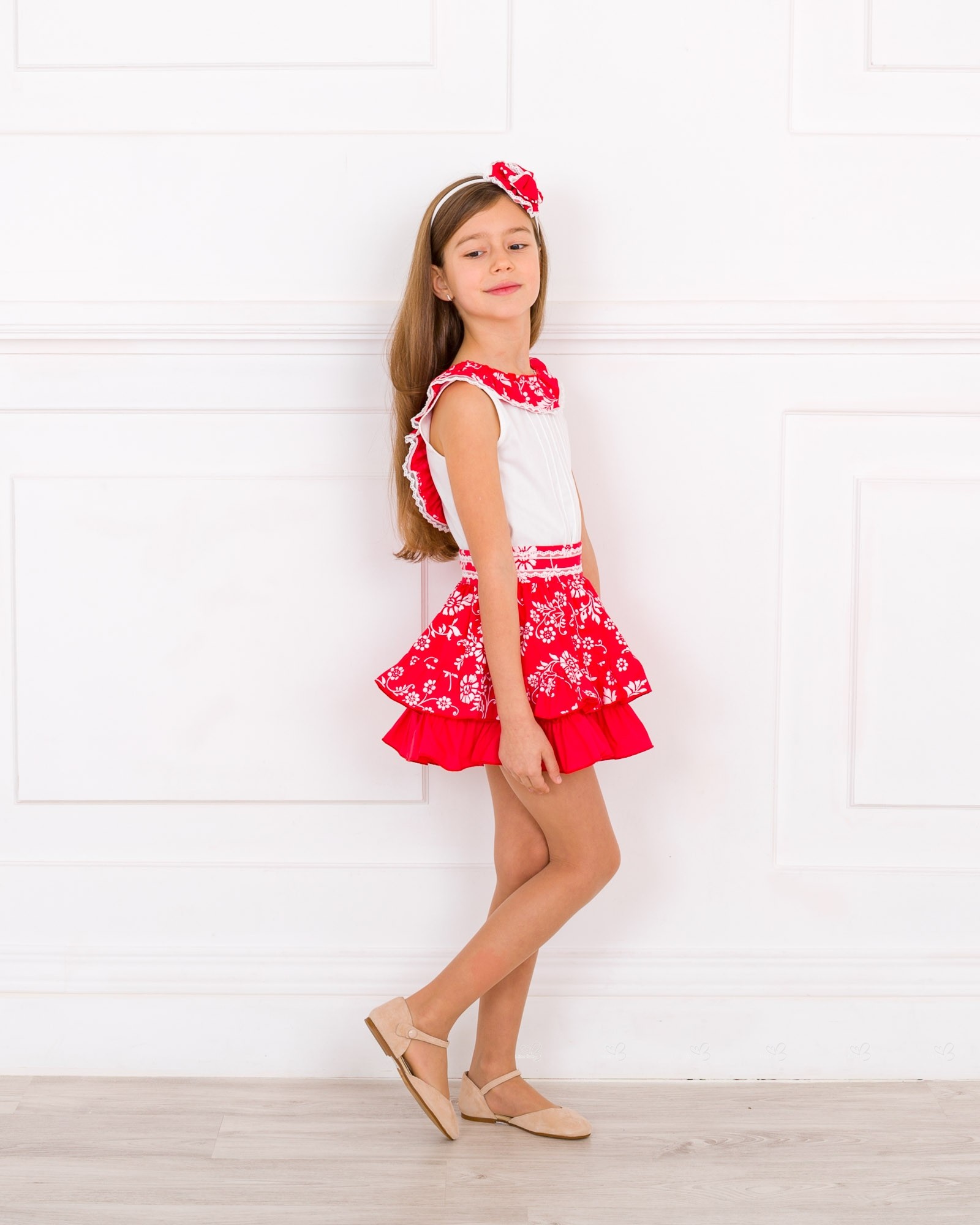 Dolce Petit Primavera-Verano 2018. Conjunto de blusa en algodón con cuello de volante en rojo terminado en U en la espalda. Abrocha con botones. Falda de volantes en rojo estampado a flores blancas. Abrocha con cremallera y botón laterales. Cintura ajustable y forro interior.