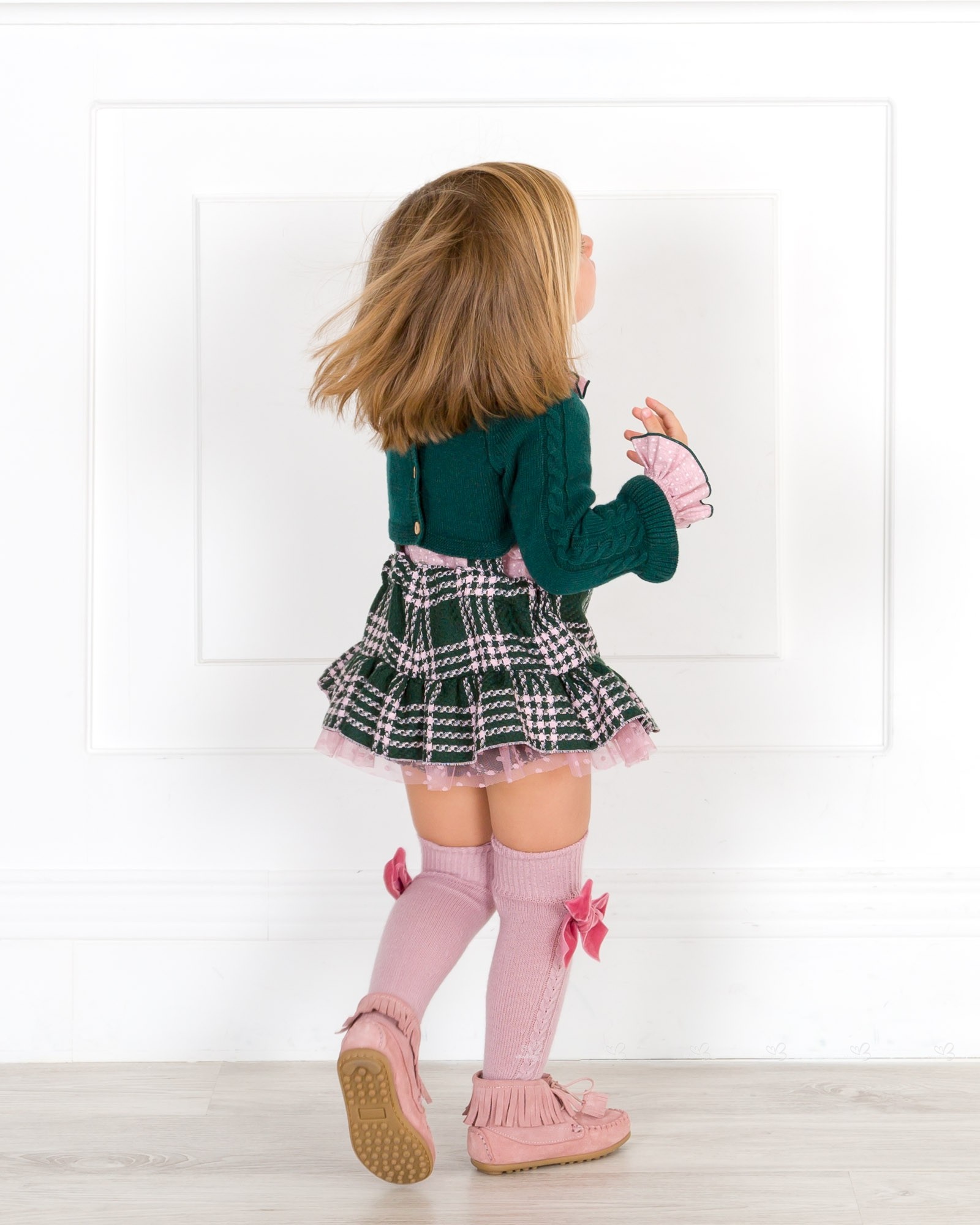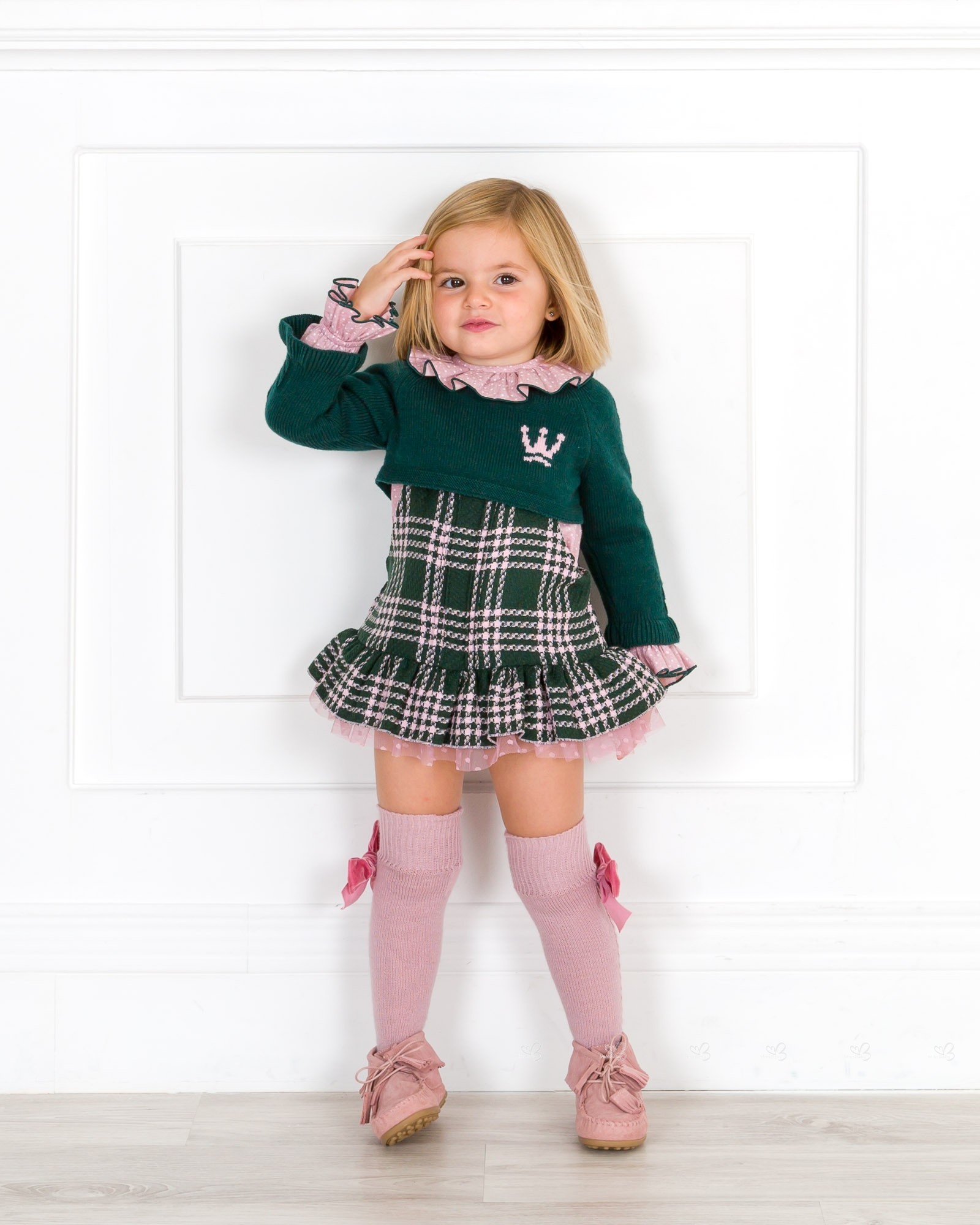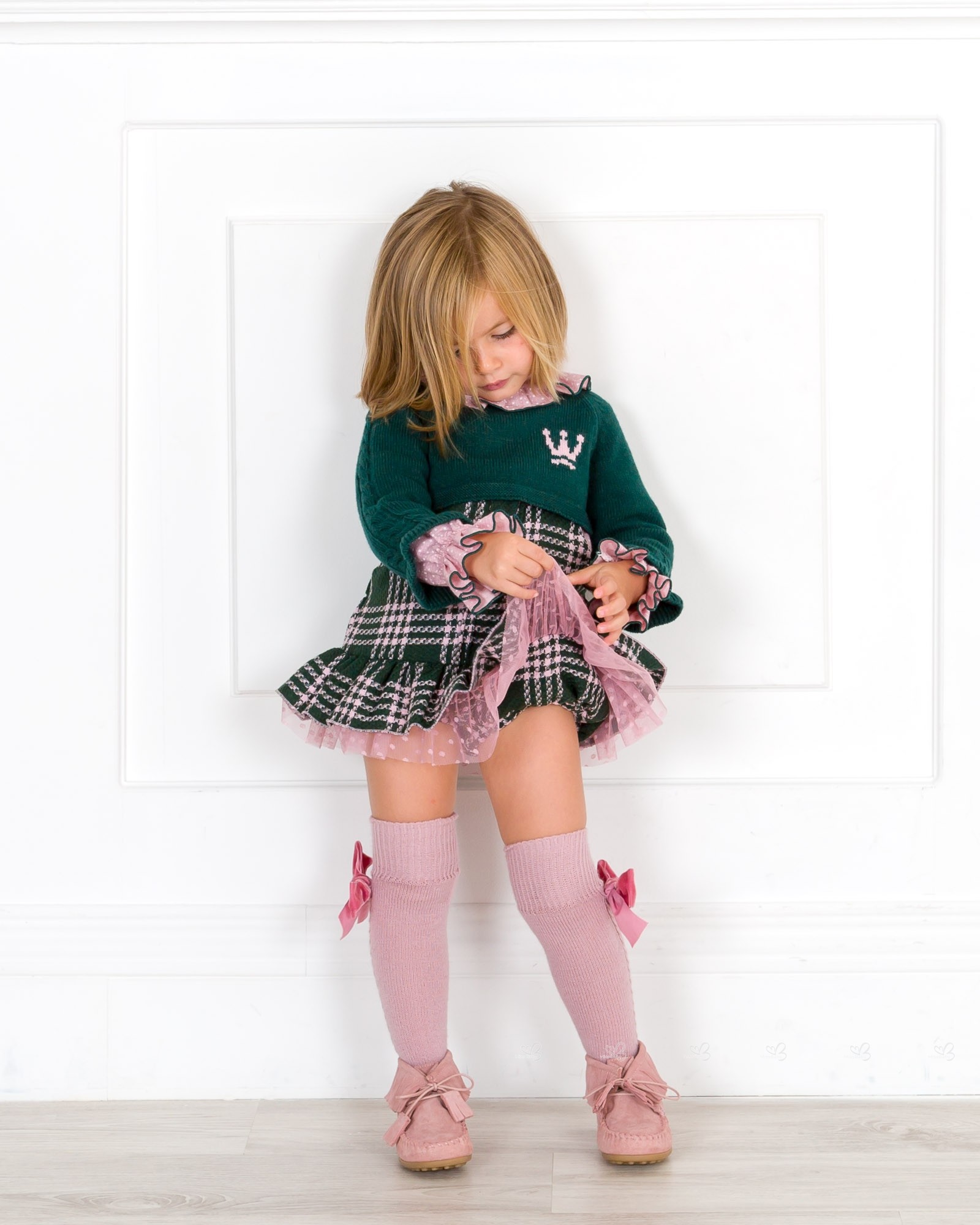 Eva Castro Baby Colección Otoño-Invierno 2018/19. Conjunto niña de la Colección Anna compuesto por blusa en color rosa con estampado de estrellitas blancas, volante fruncido en cuello-bajo mangas ribeteado en filo verde. Jersey corto en verde con corona en lateral pecho color rosa, y ranita a cuadros color verde, con volante de tul rosa. Cierre en espalda con botones.