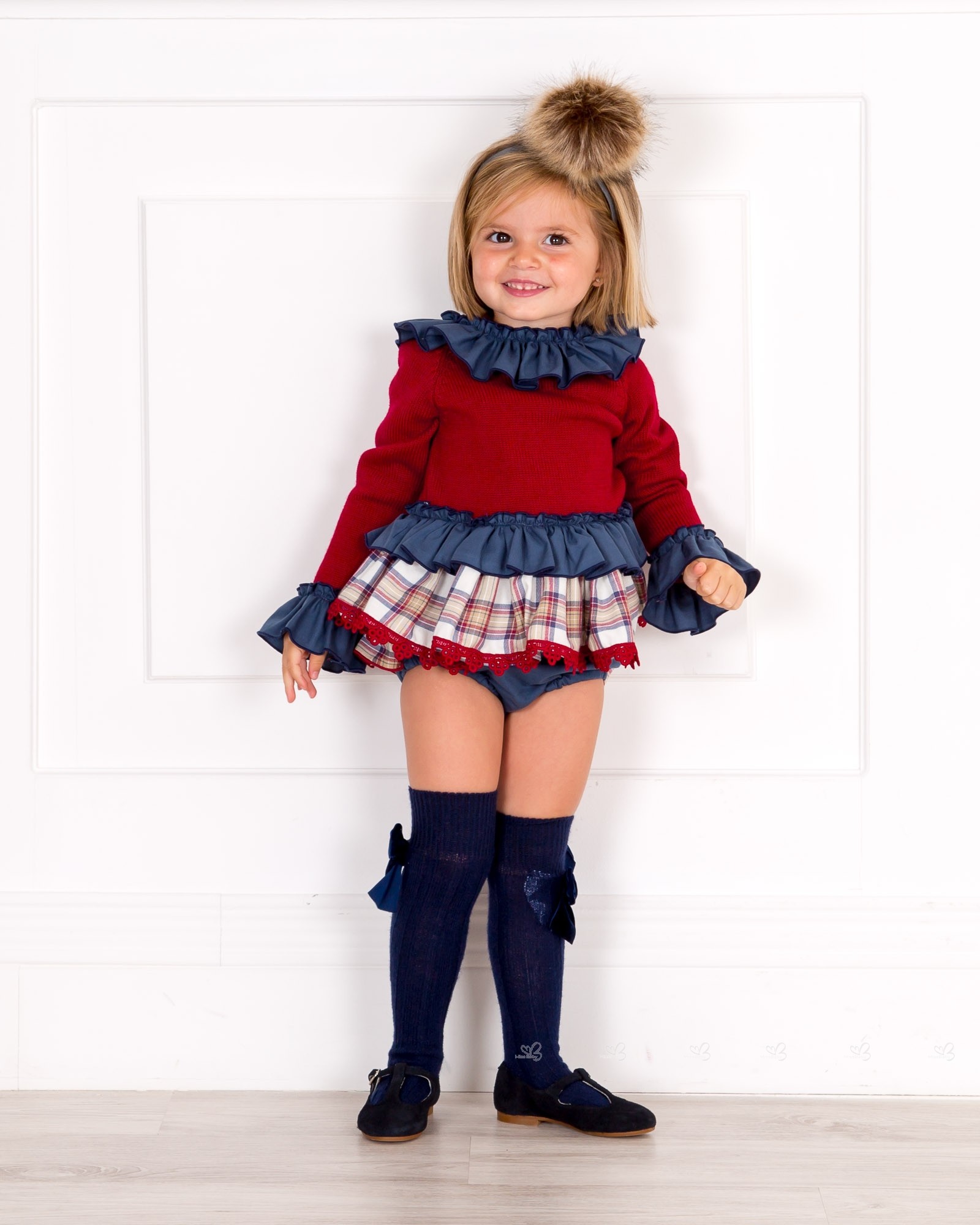 Marané Colección Otoño-Invierno 2018/19. Conjunto de niña colección Nananá compuesto por jersey de cuerpo en punto color granate con cuello y mangas volante fruncido en marino y bajo doble volante adornado de puntilla granate. Braguita de volantes a juego.
